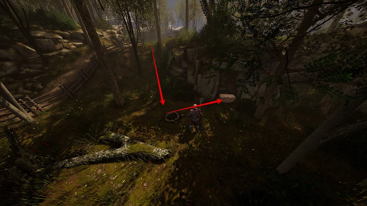 Вернитесь в лагерь и поговорите с Акимом, который попросит найти тайник лесорубов, где они прячут спиртное. Стоя перед лагерем, поверните направо и обратите внимание: слева от тропы есть деревянный заборчик. Подойдите к нему с внешней стороны — внизу увидите костёр. Рядом с очагом стоит сундук, внутри вы найдёте 20 бутылок «Ржонки» 🎯