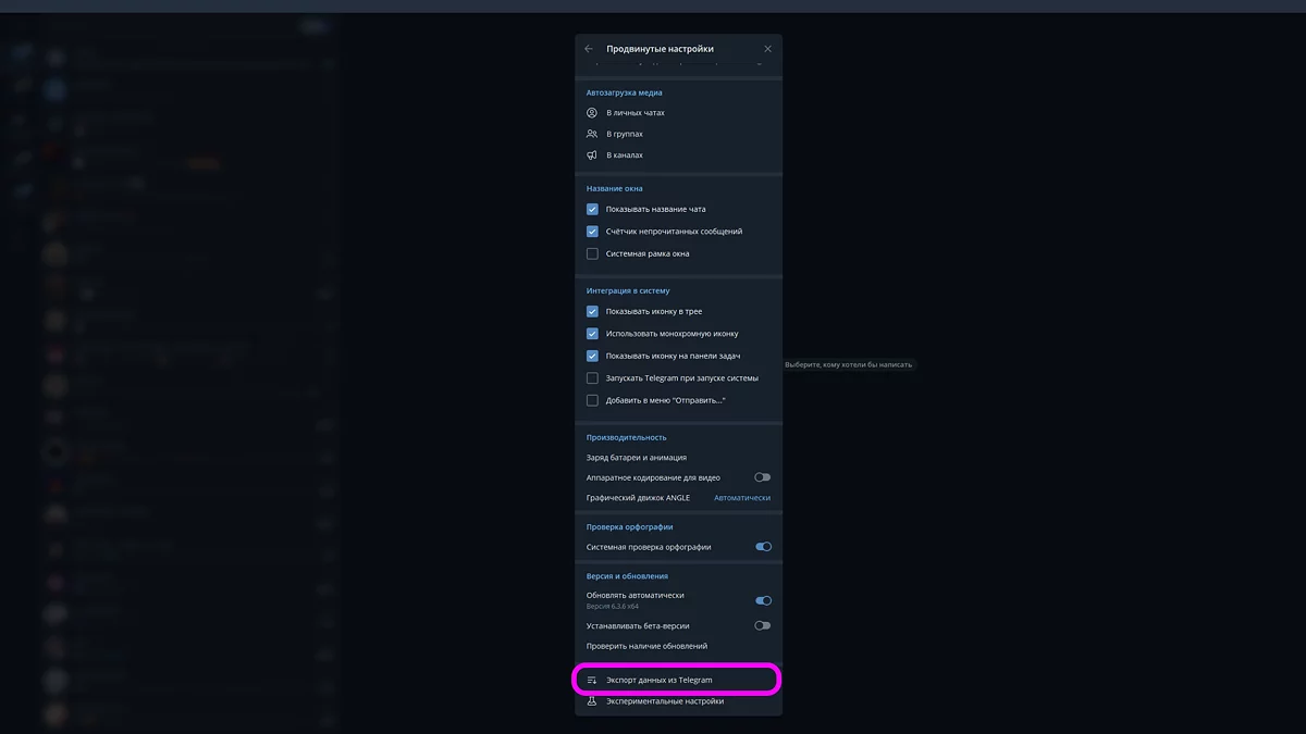 Прокрутите список до конца и откройте раздел «Экспорт данных из Telegram».