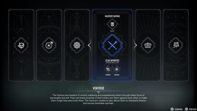 Как бы они ни возмущались, высокомерные Вентру — самый простой для входа клан. Недаром разработчики отметили их единственной меткой «Легко» в Bloodlines 2. Объяснение простое: Вентру универсальны. Неплохая физическая мощь сочетается с сильными социальными навыками и способностями к контролю толпы. Проще говоря, это «джокер» — позволяет попробовать почти все аспекты вампирских умений, не зажимая вас в жёсткую специализацию.