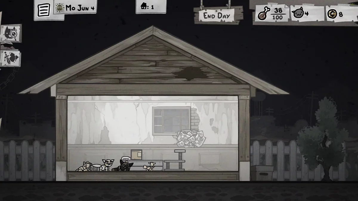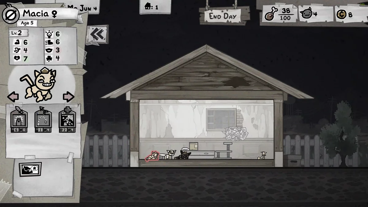 Схватки в Mewgenics — лишь половина геймплея. Вторая половина — это дом. Здесь закладываются будущие поколения: слабые линии отбраковываются, сильные — закрепляются. Каждая кошка может отправиться в приключение только один раз. После успешного забега она уходит на пенсию и больше не сражается. Но бесполезной она не становится.