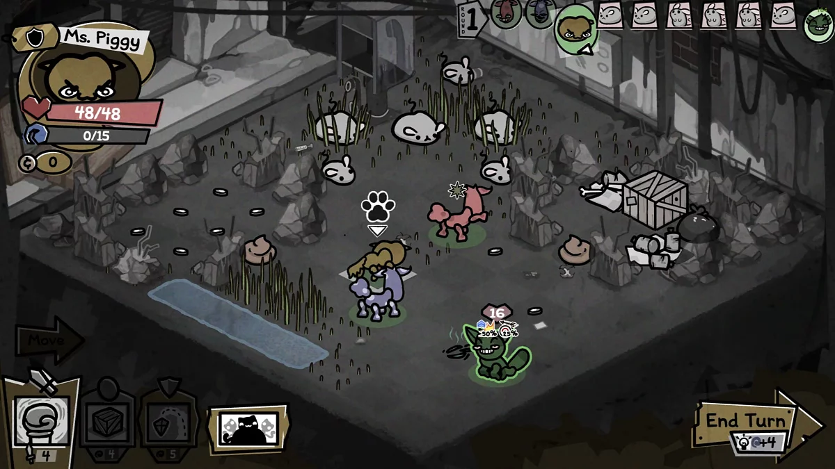 Скорость в Mewgenics определяет не только дальность перемещения конкретной кошки, но и порядок, в котором действуют участники боя. В правом верхнем углу экрана отображается очередь ходов — не игнорируйте этот важный элемент интерфейса.