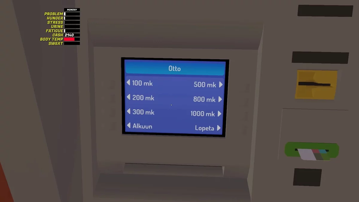 События происходят в небольшом финском городке примерно в конце 90-х. Разработчики стремились к реализму, поэтому интерфейс банкомата полностью на финском 🔤. Ниже приводим перевод всех надписей: