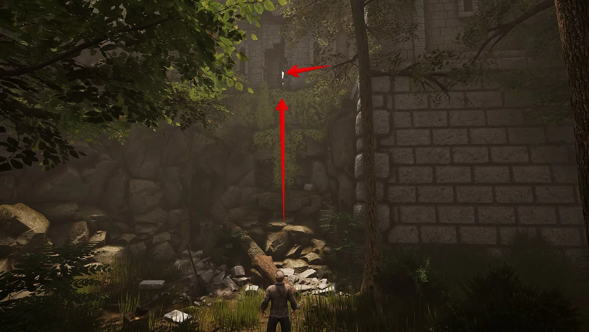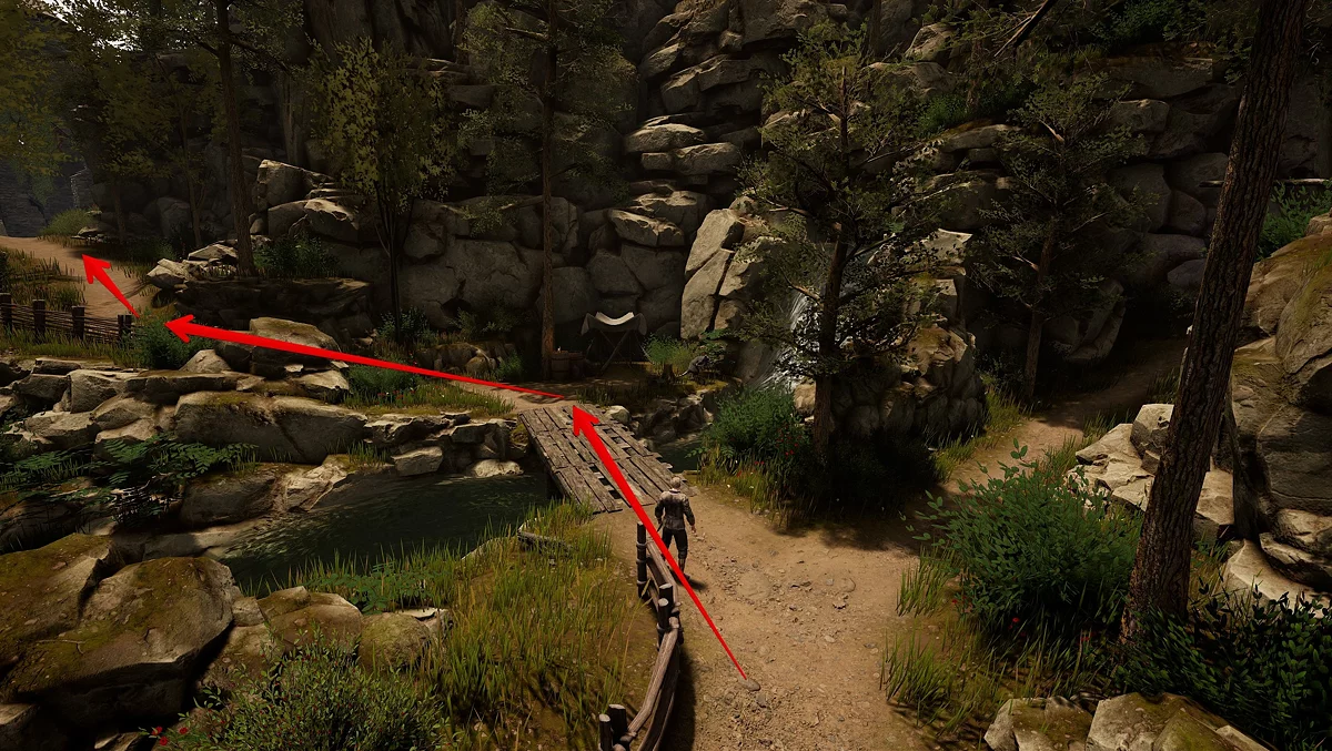 Здесь поворачивайте налево, в сторону заброшенной деревни. Войдя в поселение, увидите ещё одну развилку. Сворачивайте направо и продолжайте по тропинке мимо разрушенных домов. Не отклоняйтесь, пока не дойдёте до деревянного мостика. Возле переправы есть кострище: при наличии расходника «Лагерные припасы» (Camp Supplies) и купленного у Нереста навыка «Базовое выживание» (Basic Survival) можно отдохнуть до утра.