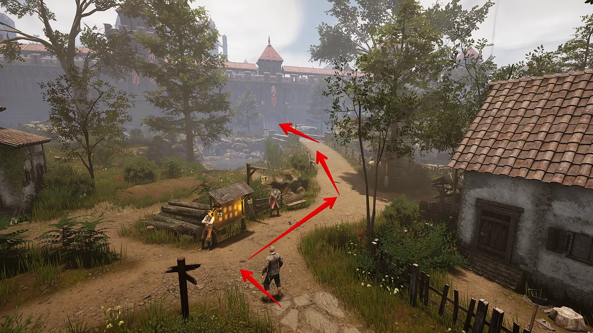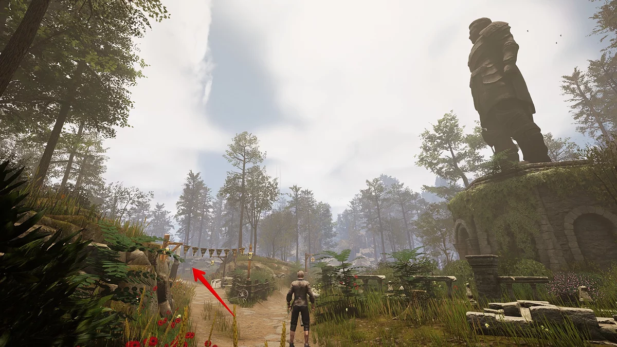 Для начала повернитесь к тропе так, чтобы компас смотрел на юг. Затем двигайтесь вперёд через первую развилку после алтаря и деревянного мостика. Здесь расположен лагерь Лиса — у него можно взять квест, он как раз по пути. Рядом стоит навигационный столб с указателями на Грейшафт, Темнолесье и Заброшенную деревню.