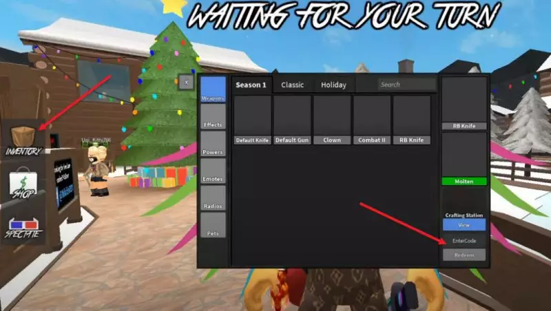 Чтобы активировать код в Мердер Мистери 2, запустите игру и откройте инвентарь (Inventory). В правом нижнем углу находится поле для ввода промокода.