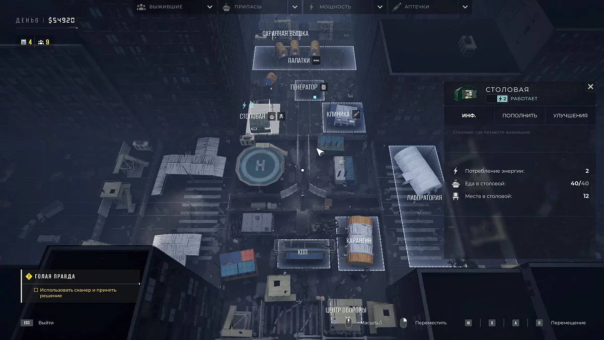 Утро начнётся с менеджмента базы. Следите, чтобы еда, припасы, аптечки и энергия всегда были в норме. Голод приводит к смертям, больные умирают или становятся зомби, а здоровые — заболевают. Здания без энергии перестают работать. Поэтому зарабатывайте как можно больше, тщательно проводя осмотры. При первой возможности улучшайте объекты: генератор, палатки, карантин, КПП и другие.