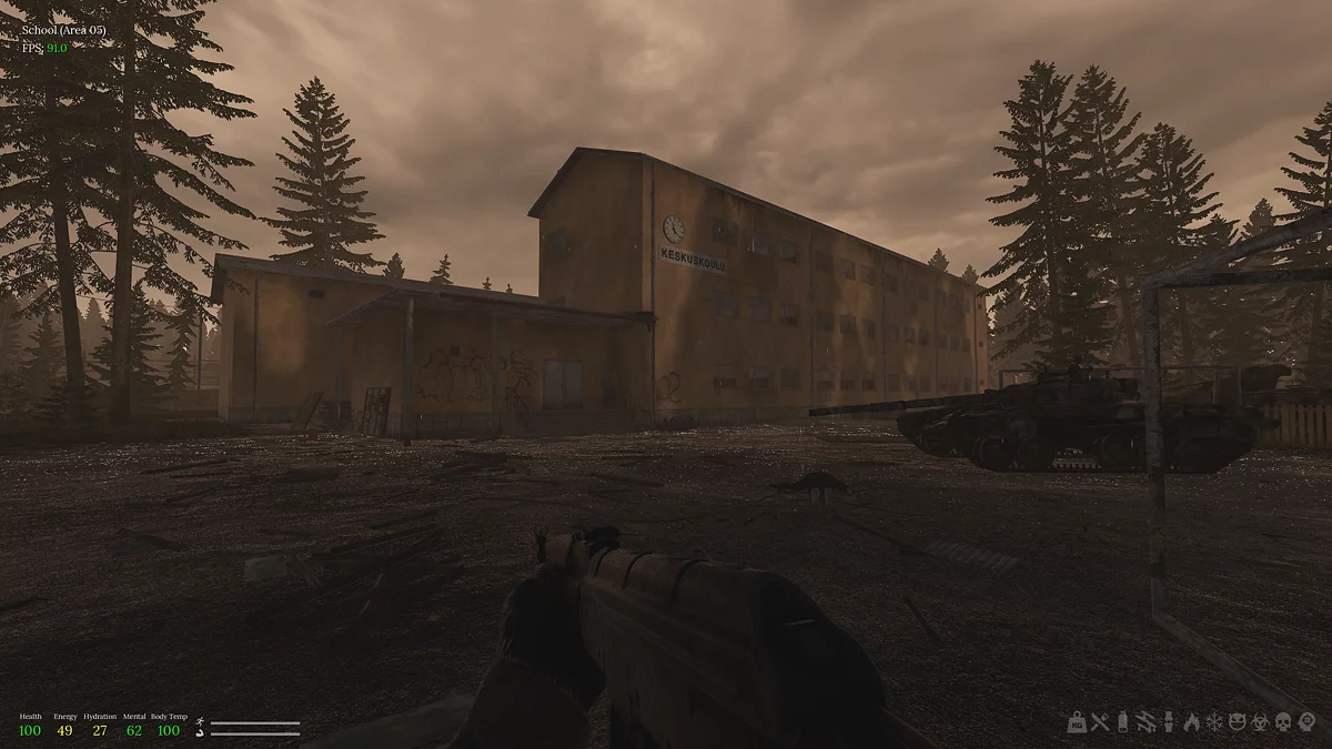 Чтобы добраться до школы, следуйте определённым ориентирам. От стартового убежища идите по грунтовой дороге прямо, пока не выйдете на центральную улицу с домами. Затем найдите слева небольшую тропинку среди деревьев. Продолжайте путь по ней до перекрёстка, после чего поверните направо и двигайтесь до конца локации. На границе вам будет предложено переместиться в школу, заплатив 5 единиц сытости, 10 единиц жажды и 1 час времени.