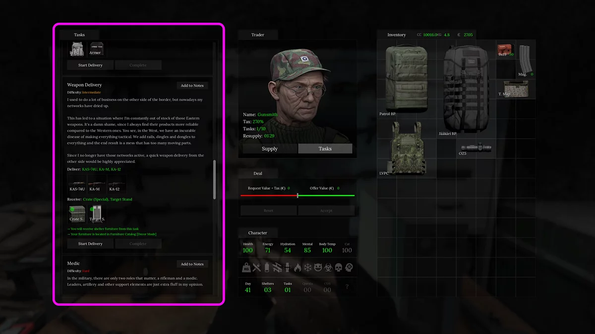 У каждого NPC есть набор из десяти поручений, поделённых по уровню сложности на лёгкие, средние и тяжёлые. Чем выше сложность взятой миссии, тем более ценную награду вы получите. На финальном уровне любой торговец вручит вам ключи от своего локального бункера.