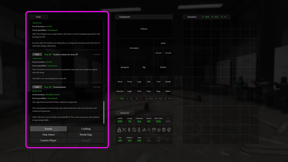 Далеко не все продавцы становятся доступны сразу. В игре присутствует система событий, которые запускаются в определённые игровые сутки. Например, Доктор появится в школе лишь на второй день, а Gunsmith объявится в бункере аванпоста только на десятый. У вас будет время, чтобы найти ценное добро и даже заранее подготовиться к некоторым поручениям.