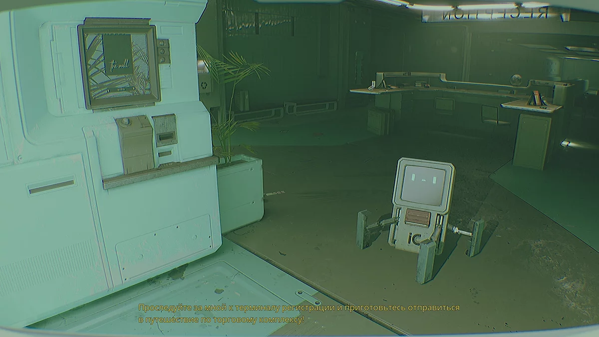 На развилке поверните налево, взаимодействуйте с терминалом и выйдите в просторный зал. Робот здесь неактивен — проходите спокойно. Справа от него спуститесь в вентиляцию. Опасностей нет, можно ползти без опаски. В конце нажмите красную кнопку справа — окажетесь в комнате охраны. На терминале найдите комнату регистрации, поверните камеру вправо и максимально приблизьте изображение.
