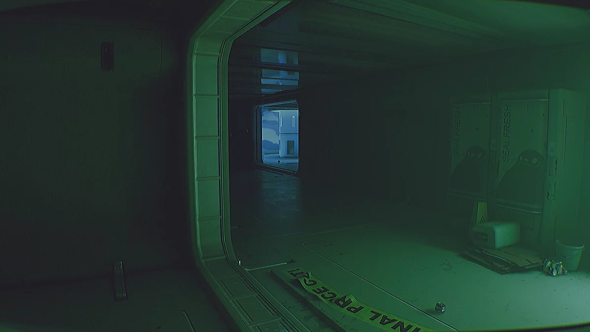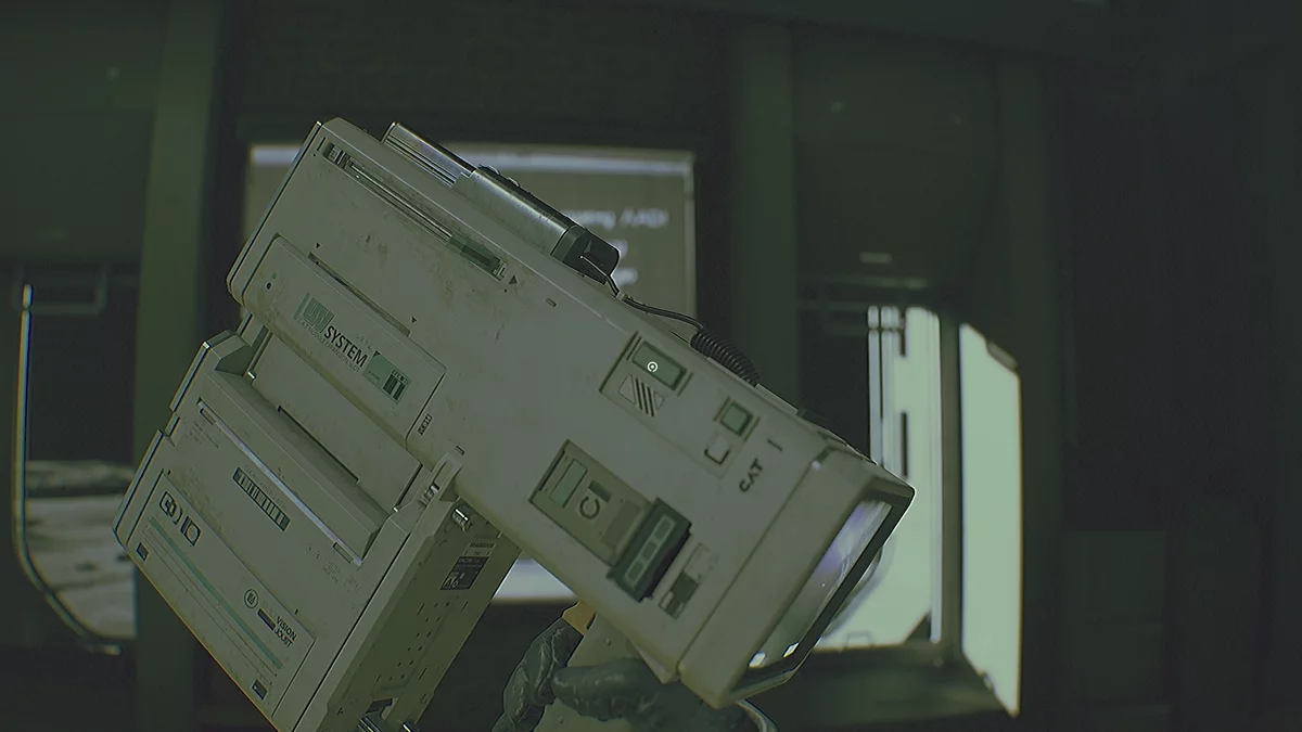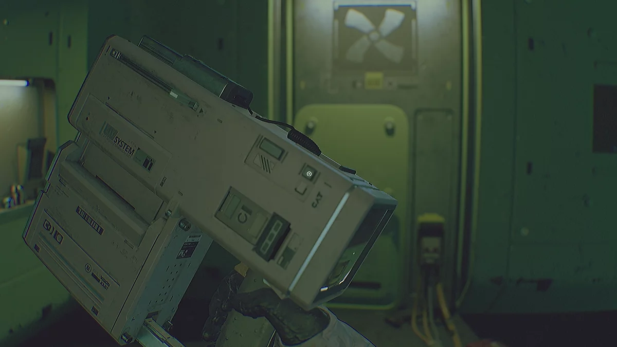 Внутри подойдите к левой стойке и возьмите первое улучшение для индивидуального помощника космонавта — модуль «Смотритель». Он добавляет фонарик и ультрафиолетовый режим. С его помощью можно узнавать коды некоторых панелей, считывая отпечатки пальцев. Для активации «Смотрителя» нажмите отсек под предохранителем. УФ‑режим не расходует заряд аккумулятора.