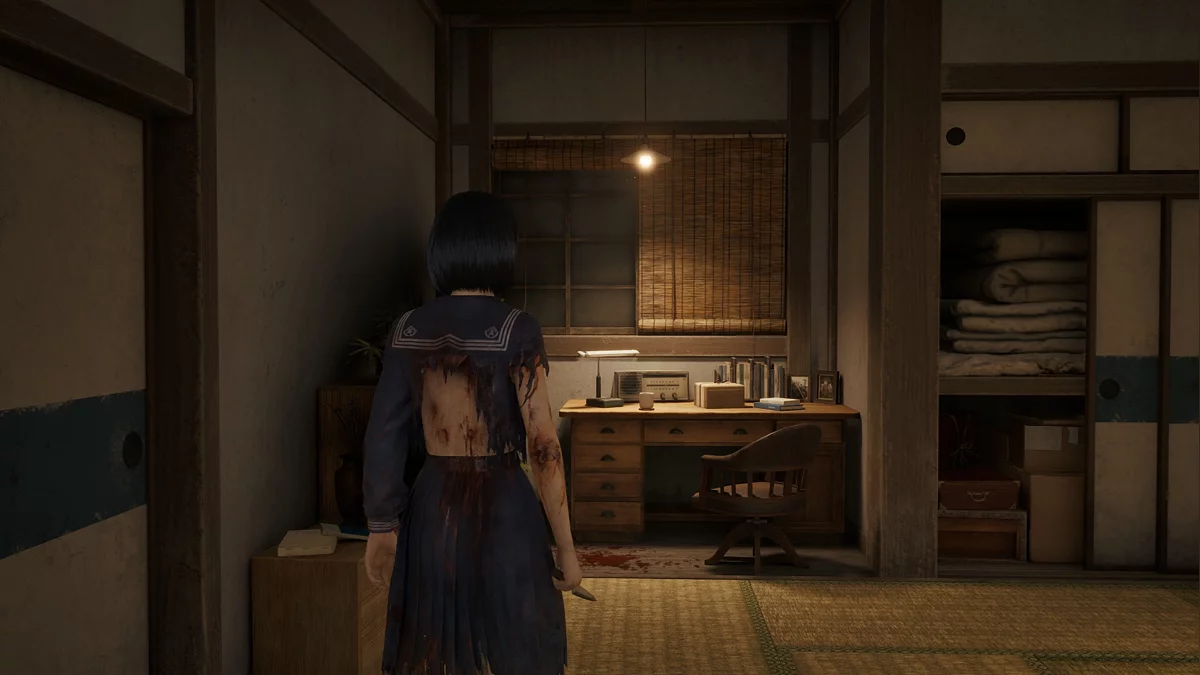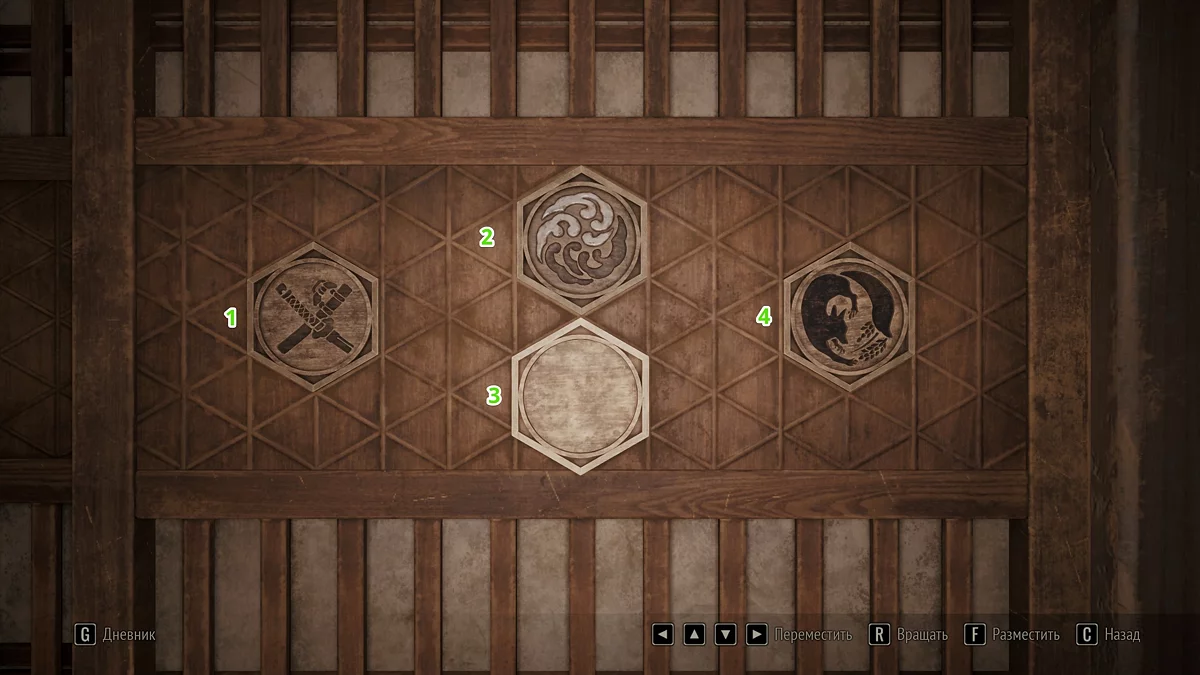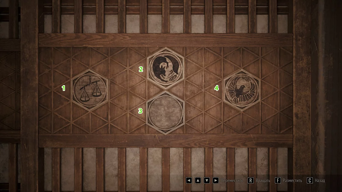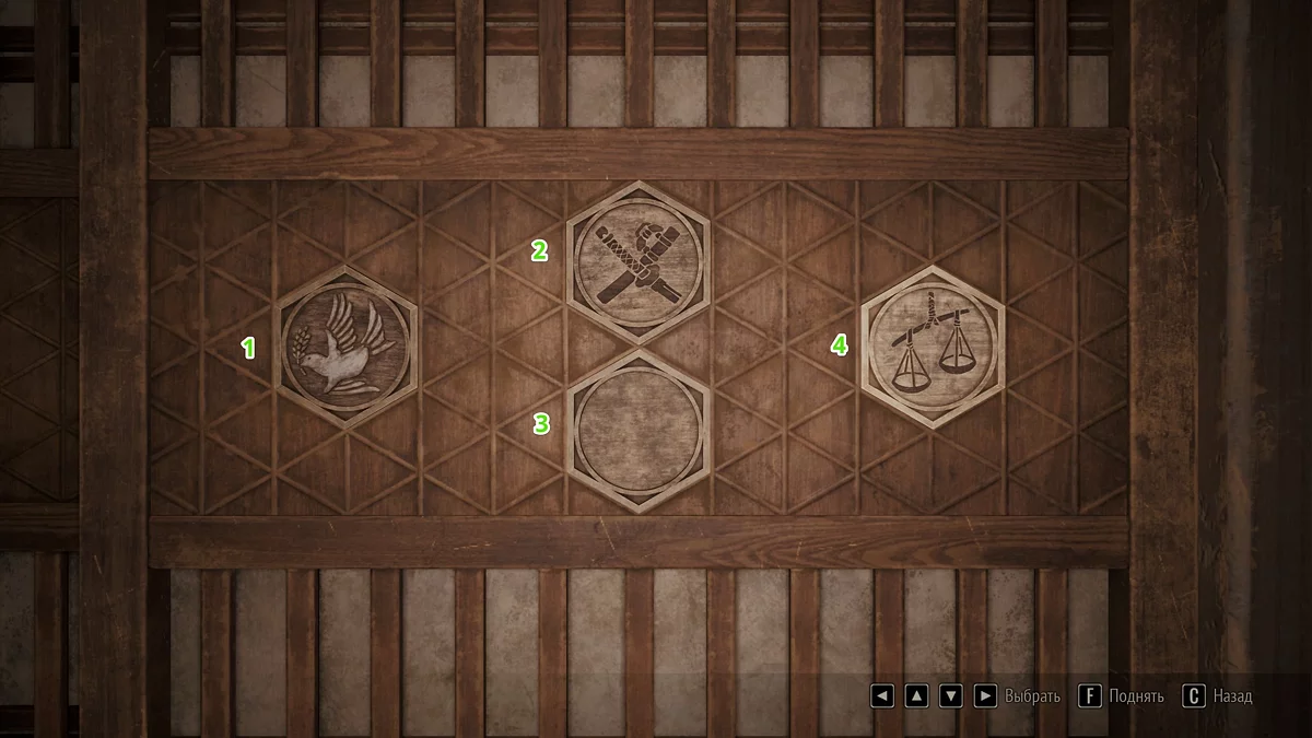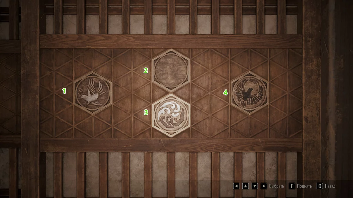 Когда все пластины собраны, подойдите к двери справа от перехода между первым и вторым уровнями дома Симидзу. Ознакомьтесь с запиской у ширмы и выстройте плашки в корректной последовательности. Для разных концовок меняются как решение, так и текст подсказки — подробности описаны ниже.