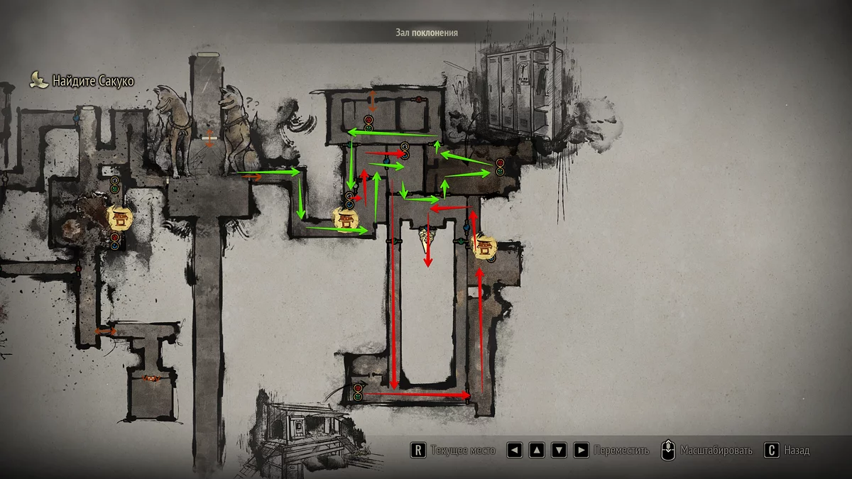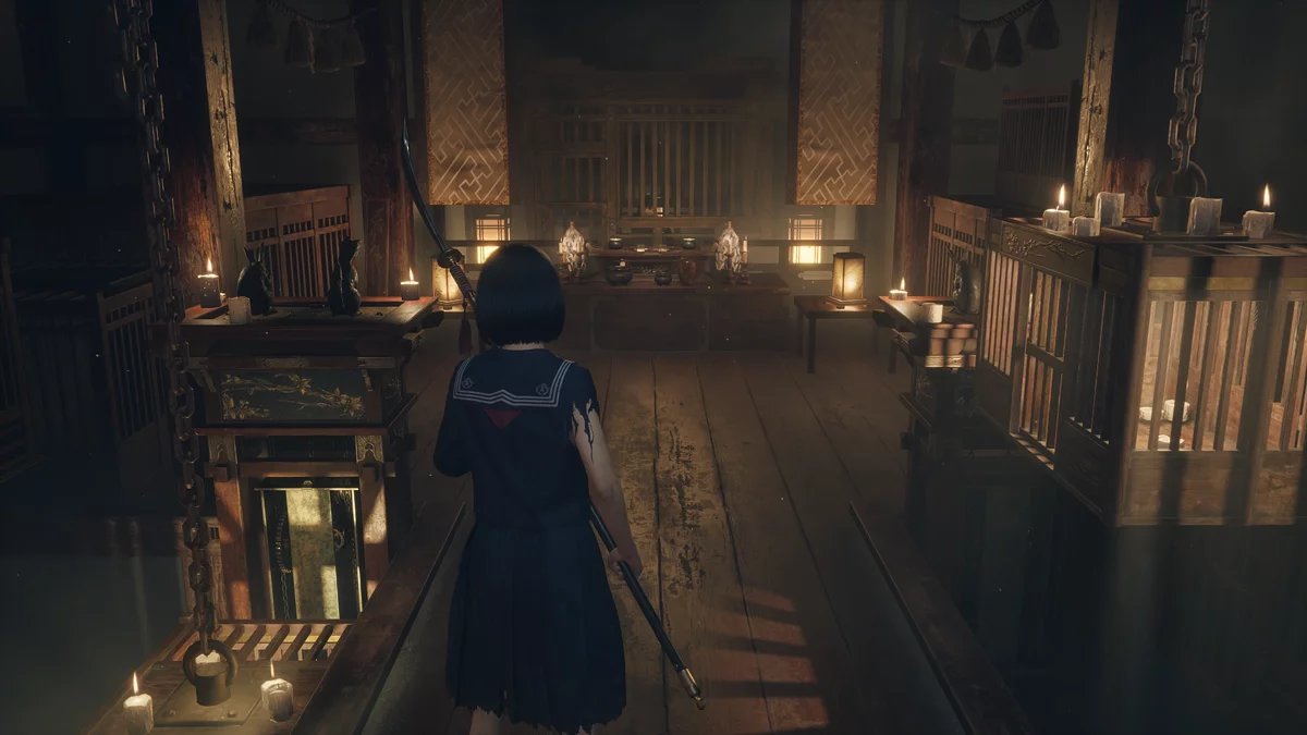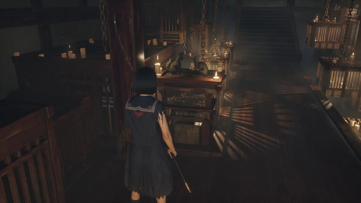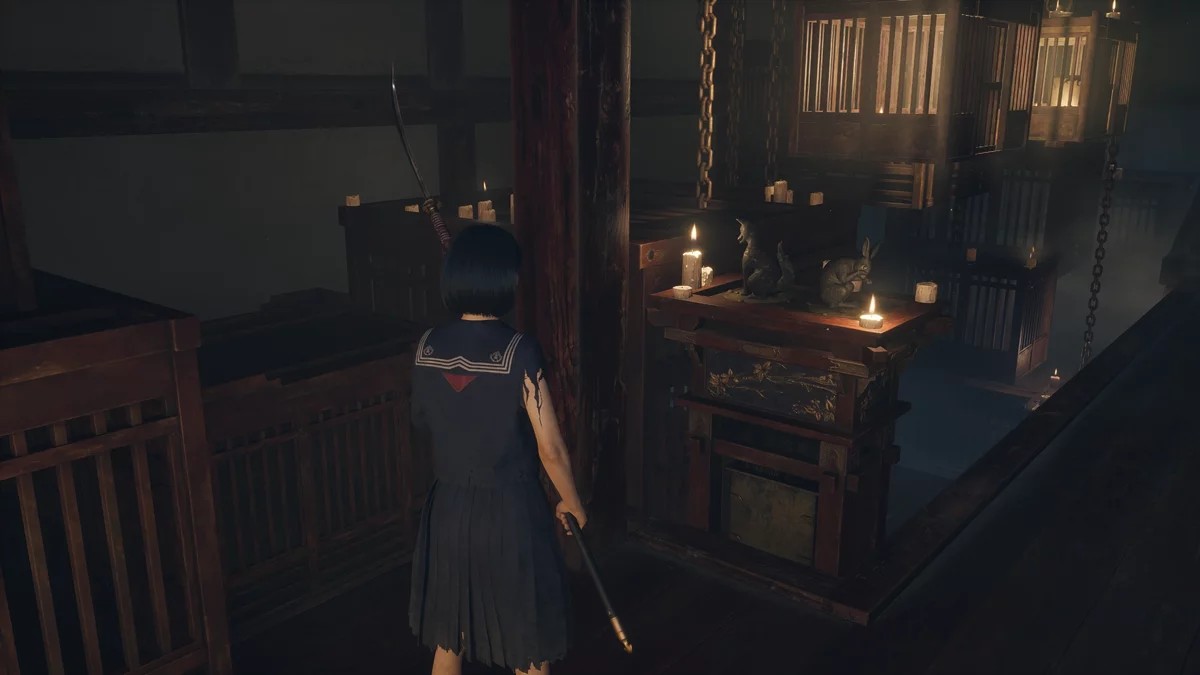 На алтаре возле клетки находится ключ с эмблемой — белым кроликом. Вставьте его в правую скважину под лапами статуи Инари, чтобы отпереть священную дверь. После этого Хинако попадёт в финальный зал подношений и сможет покинуть тёмное святилище.