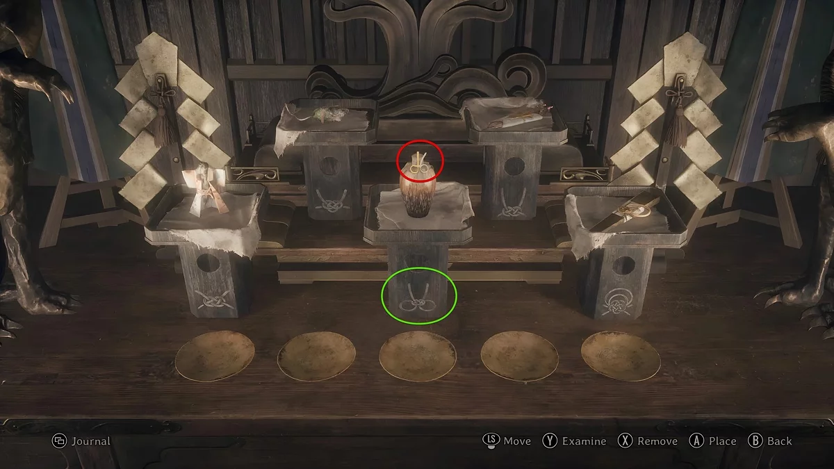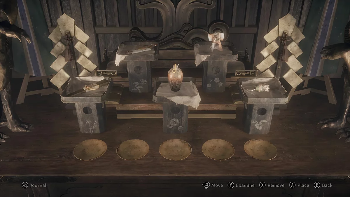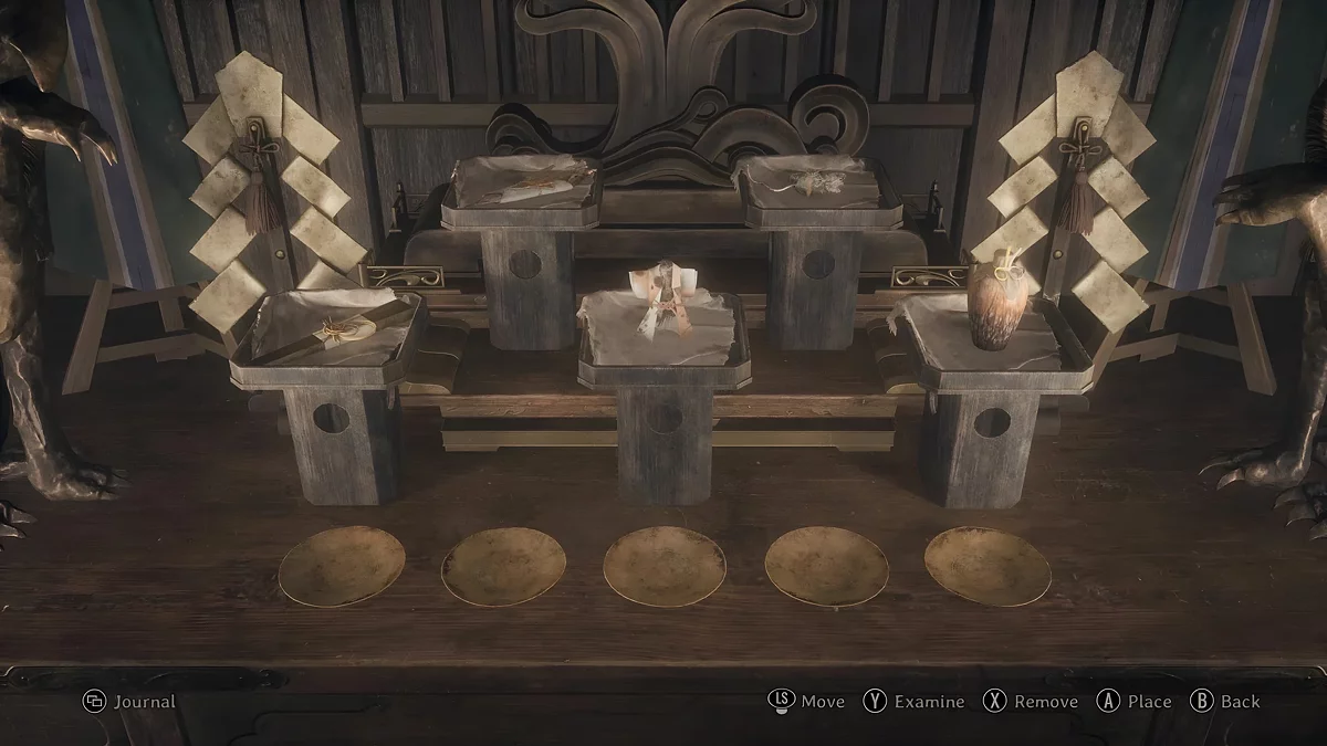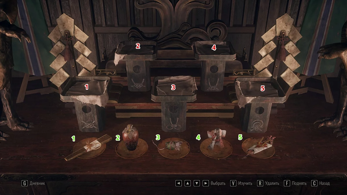 Перед вами в чашах находятся пять вещей, которые требуется разместить на стойках в конкретной последовательности. Ниже указан порядок укладки подношений для всех уровней сложности.