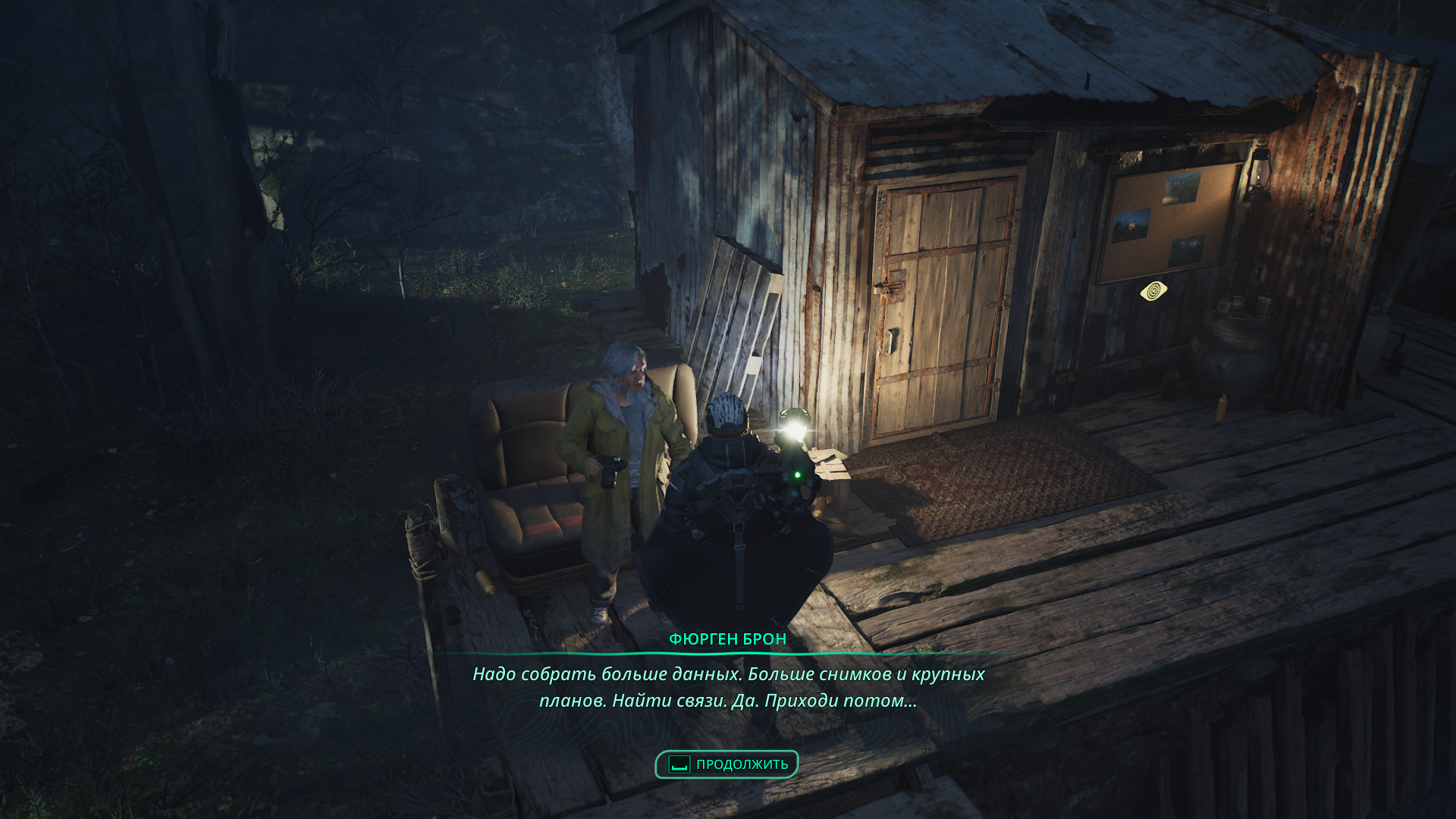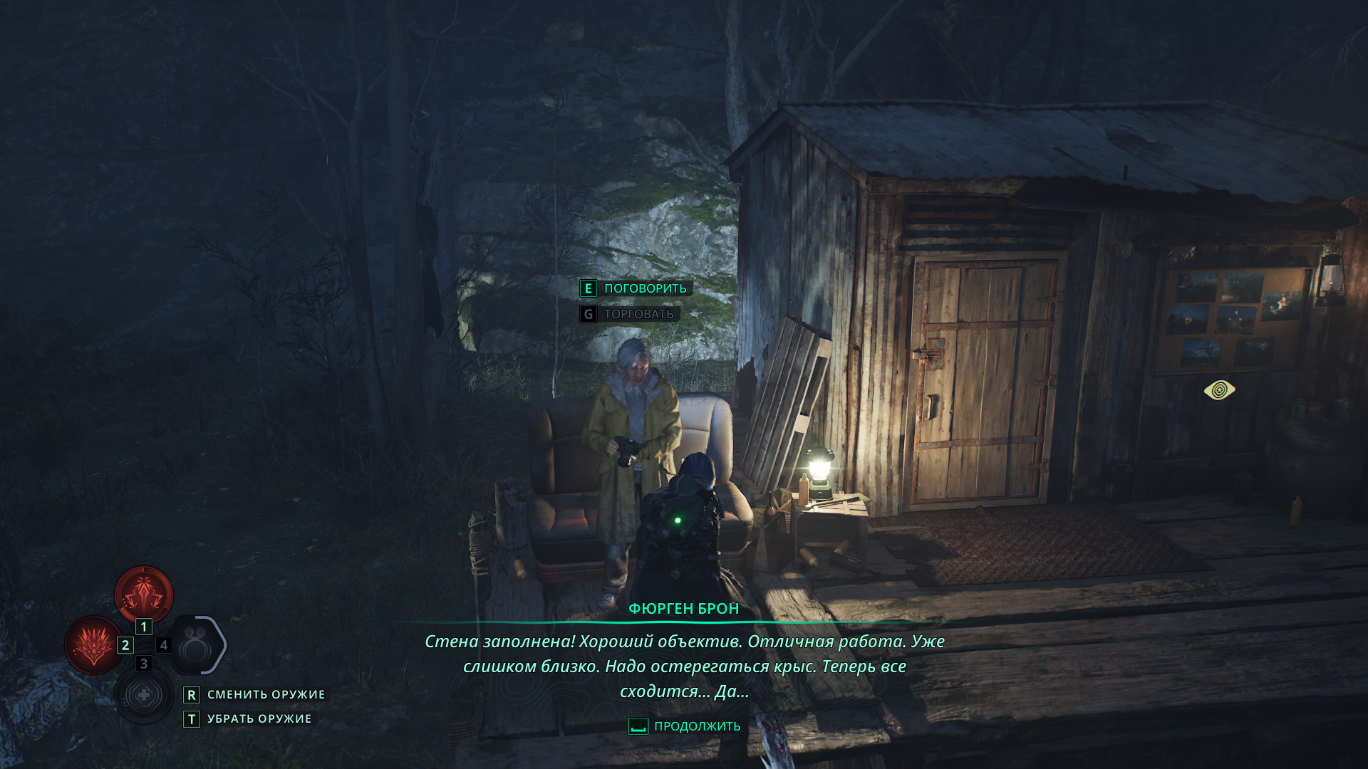 Учтите: если передать предмет через опцию «Торговать», сначала вы получите лишь благодарность. Придется покинуть болота Акаса и потом вернуться — тогда стенд у хижины пополнится новыми снимками.