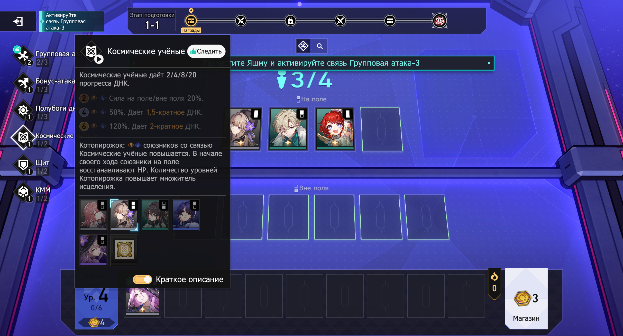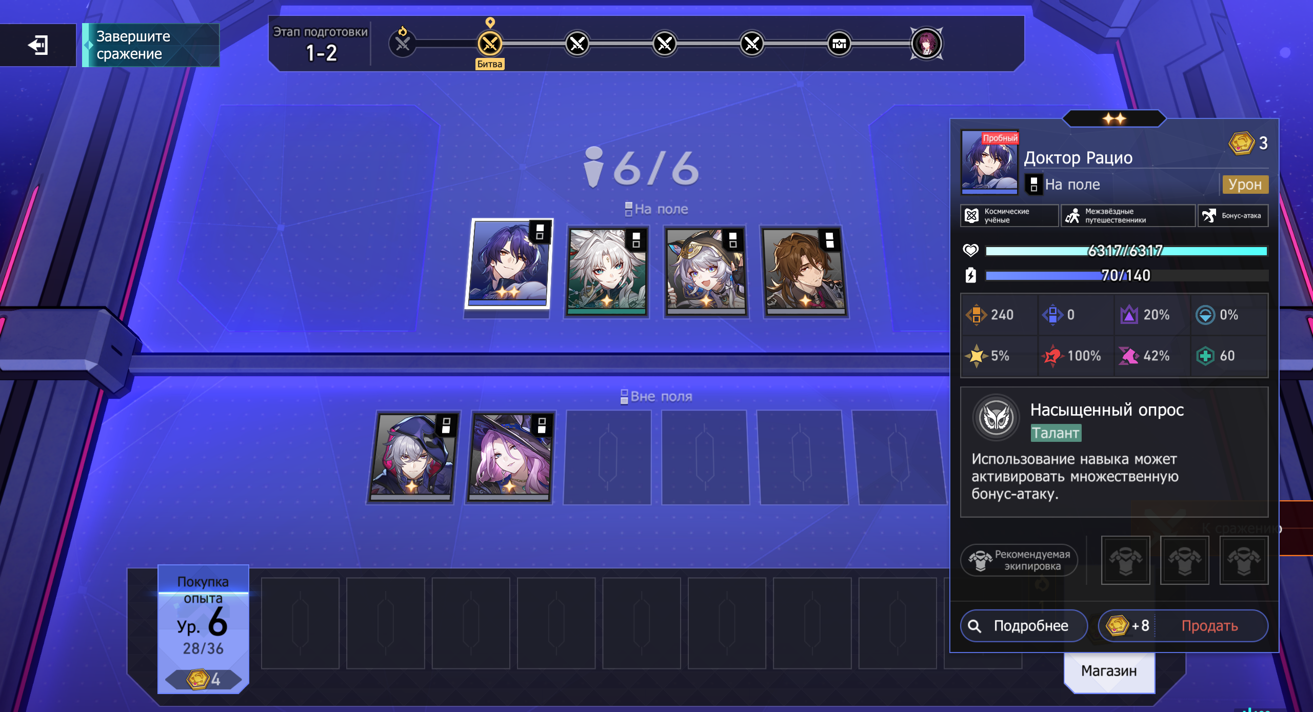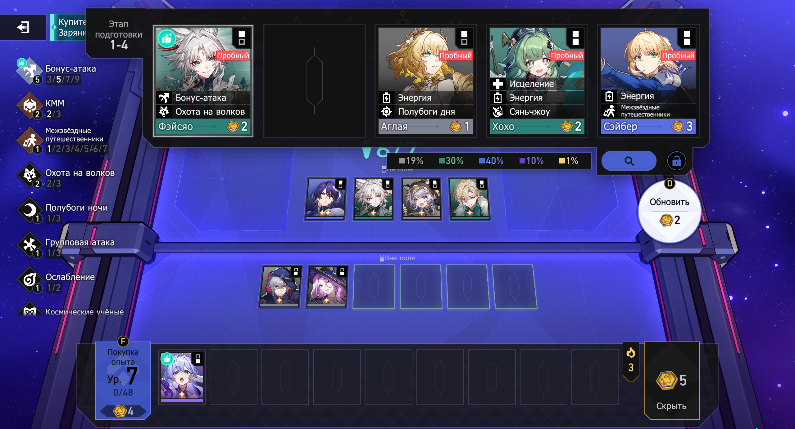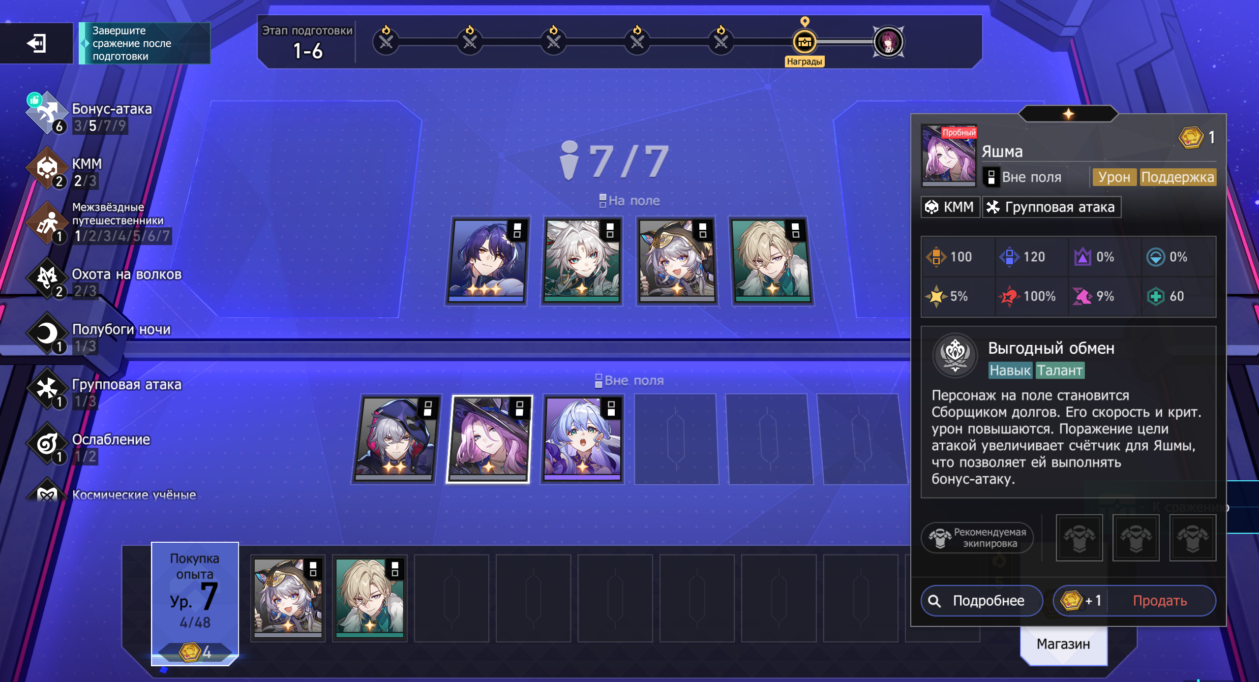 Вне поля – остальные персонажи с пассивными эффектами. Они лечат, усиливают баффами, обеспечивают огневую поддержку.