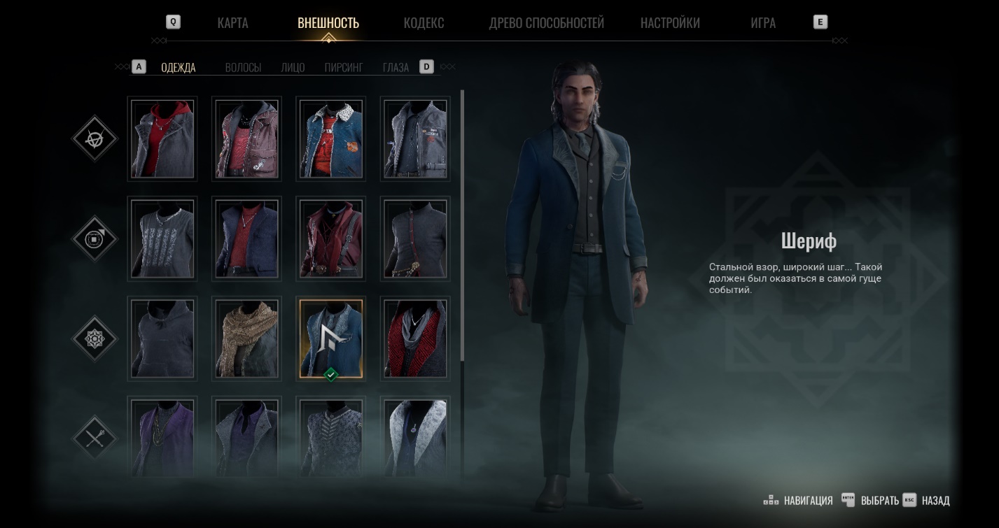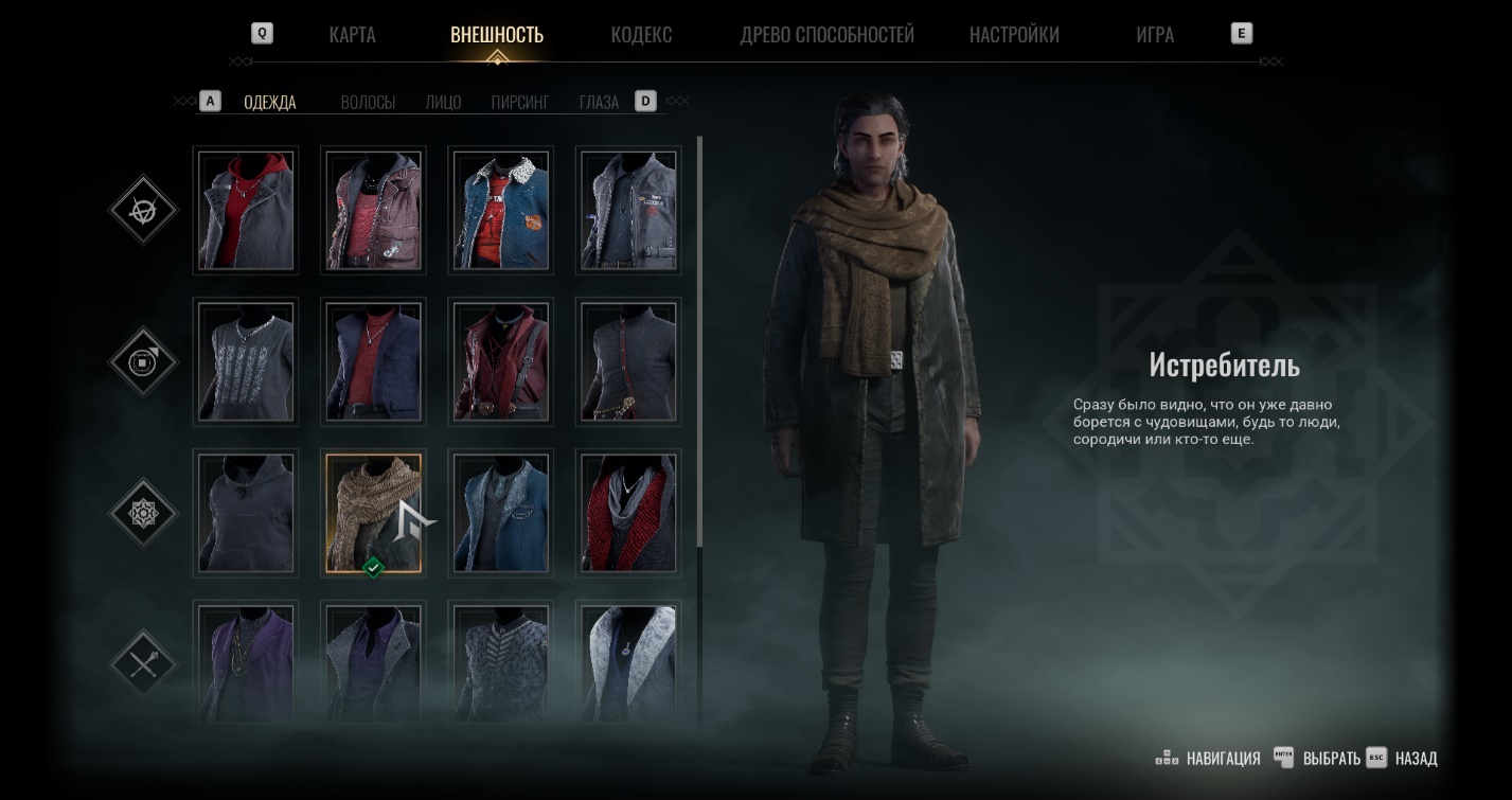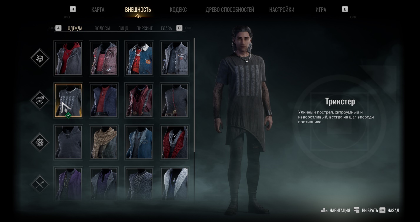 Изменить внешний вид персонажа можно во вкладке «Внешность» в меню паузы (нажмите клавишу TAB). Здесь доступна смена одежды, а также редактирование причёски, цвета глаз, пирсинга, шрамов и лицевых украшений. Менять внешность разрешается в любое время и без ограничений по количеству.