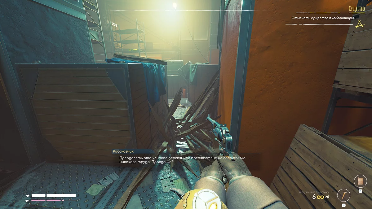 После слов рассказчика пройдите в коридор спереди и войдите в складское помещение, предварительно сломав доски в проходе.