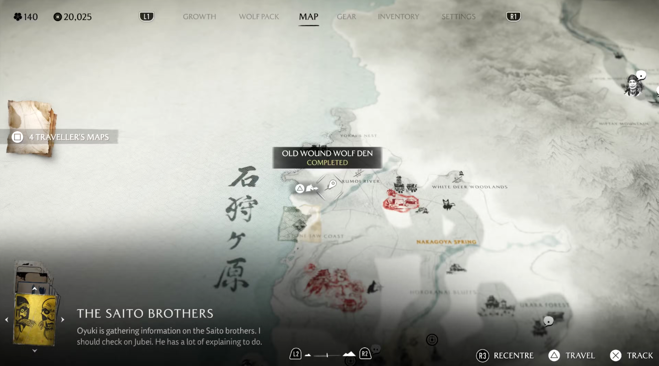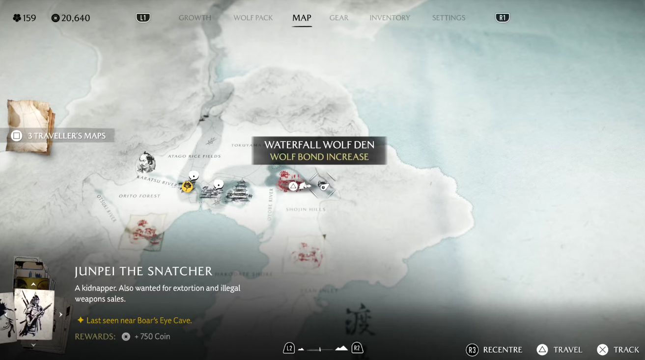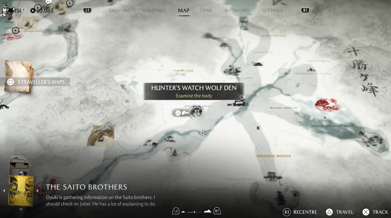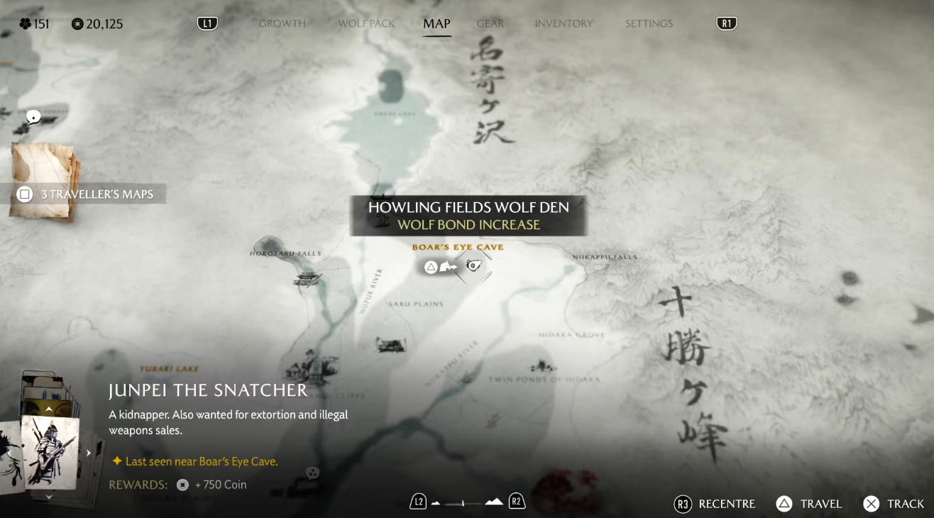 Двигайтесь на север, в равнины Охара. Между буквами A и P в надписи Ohara Plains на карте заметна скала с растущим сверху деревом — там и расположено очередное волчье логово. Местность вокруг плотно охраняется противниками, поэтому зачистите её, чтобы Волчица смогла выйти из укрытия и привести вас к лагерю разбойников.