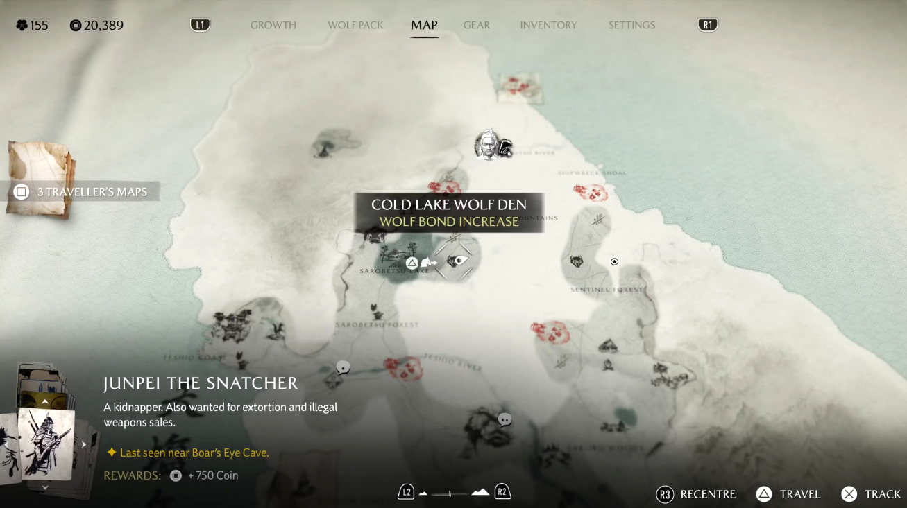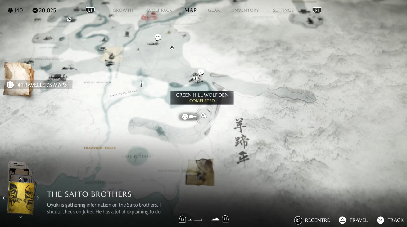 Отправляйтесь к южному берегу озера Сикоцу, немного ниже дома Ацу. На небольшом каменистом пригорке с одиноким деревом наверху находится первое волчье логово. Чтобы запустить кат-сцену с появлением Волчицы, подойдите к трупам у входа и осмотрите их (кнопка R2). Затем начнётся погоня: Ацу автоматически оседлает коня и устремится за Волчицей к вражескому лагерю, где предстоит ликвидировать всех браконьеров, разбойников Сайто.