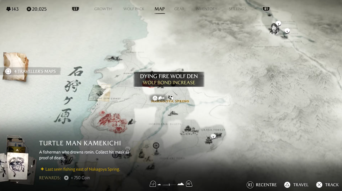 Идите вдоль северо-восточной реки через холмы Хороканай, пока не дойдёте до источника Накагоя. Чуть выше букв Y и A в названии Nakogoya расположено следующее волчье логово. Как и ранее, осмотрите тела у входа, чтобы активировать кат-сцену: появится Волчица и отведёт Ацу к очередному укрытию браконьеров и волкодавов.