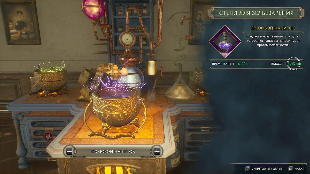 Из выращенных растений варятся зелья, заметно помогающие в сражениях. Не пренебрегайте этой механикой — она упрощает и разнообразит бои в Hogwarts Legacy. У каждого зелья собственные ингредиенты и таймер варки. Также ограничен переносимый запас: одновременно можно иметь до 20 Рябинового отвара и по 12 единиц остальных зелий.