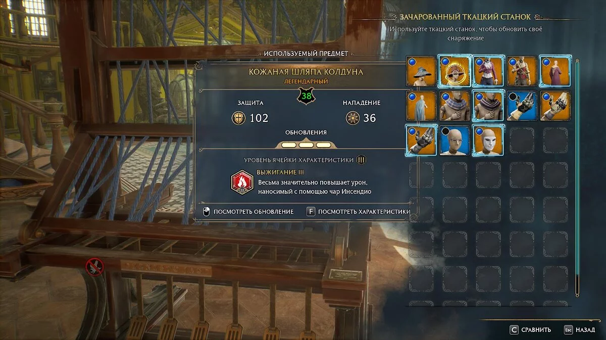 Для прокачки нужен зачарованный ткацкий станок. На выбранной вещи нажмите ПКМ, чтобы открыть меню улучшений. Предметы, надетые в данный момент, отмечены синим шлейфом. Набор и редкость материалов зависят от уровня экипировки.