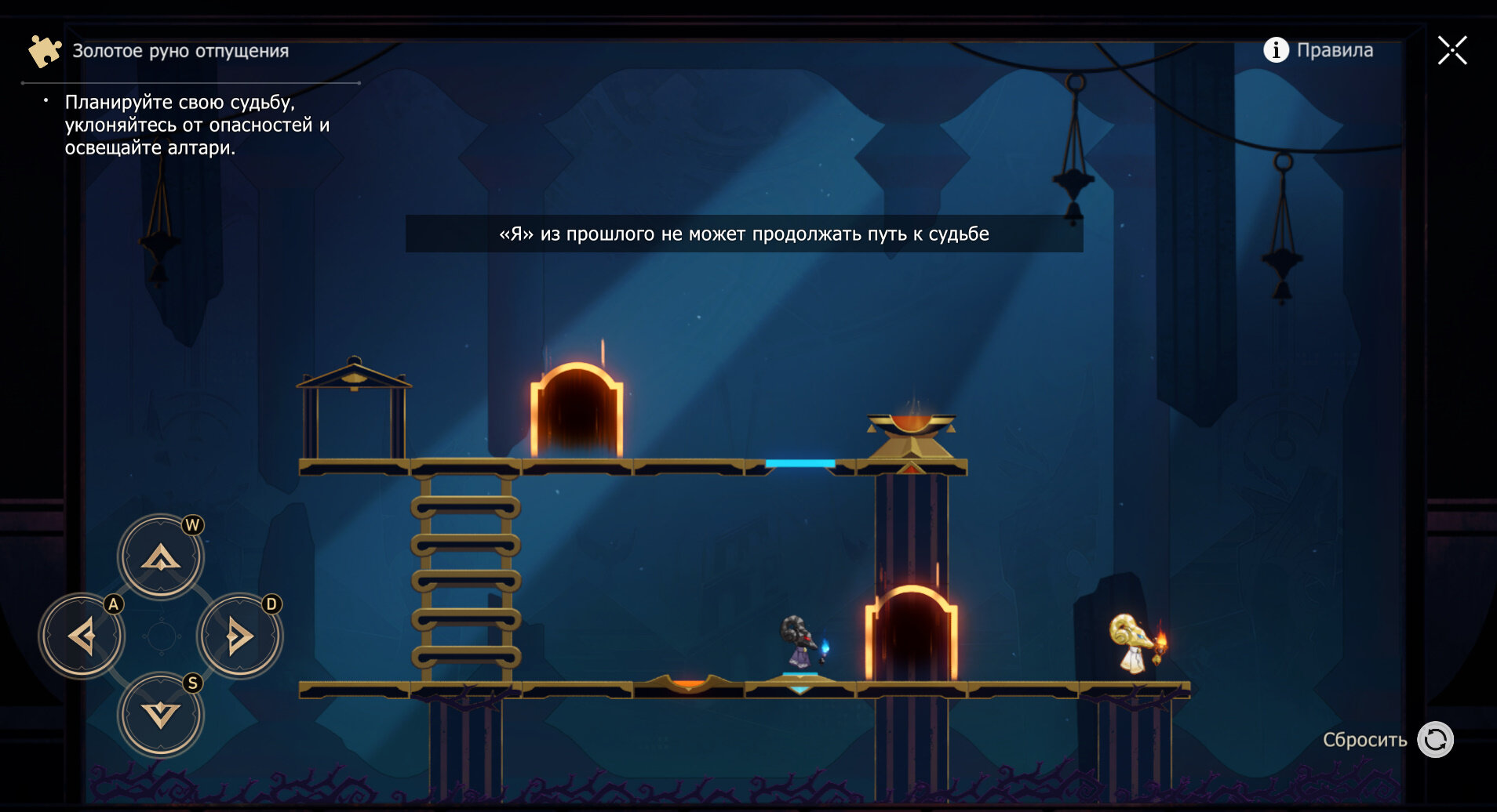 Появится руно из прошлого. Поднимайтесь и опускайтесь по лестнице с желтой кнопкой дважды — вверх и вниз — пока Я из прошлого не окажется внизу; после этого идите к голубой кнопке справа.