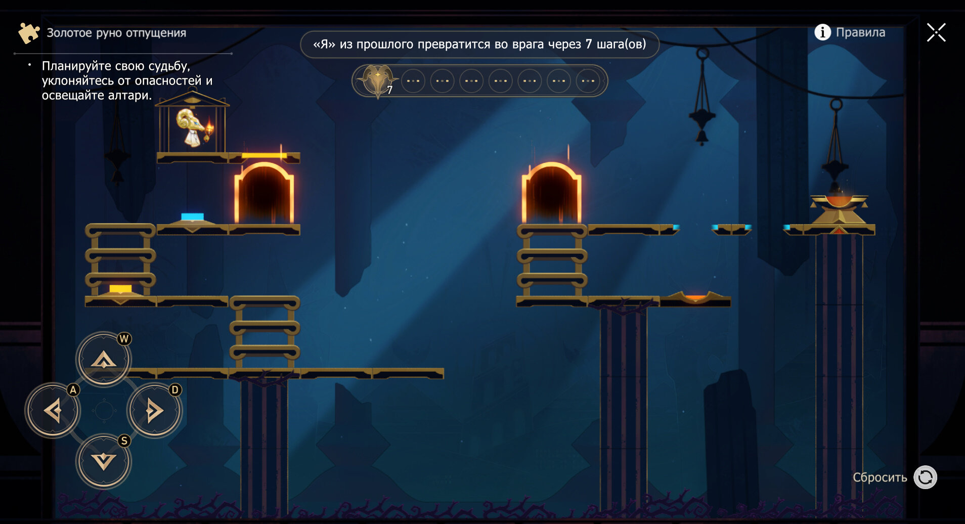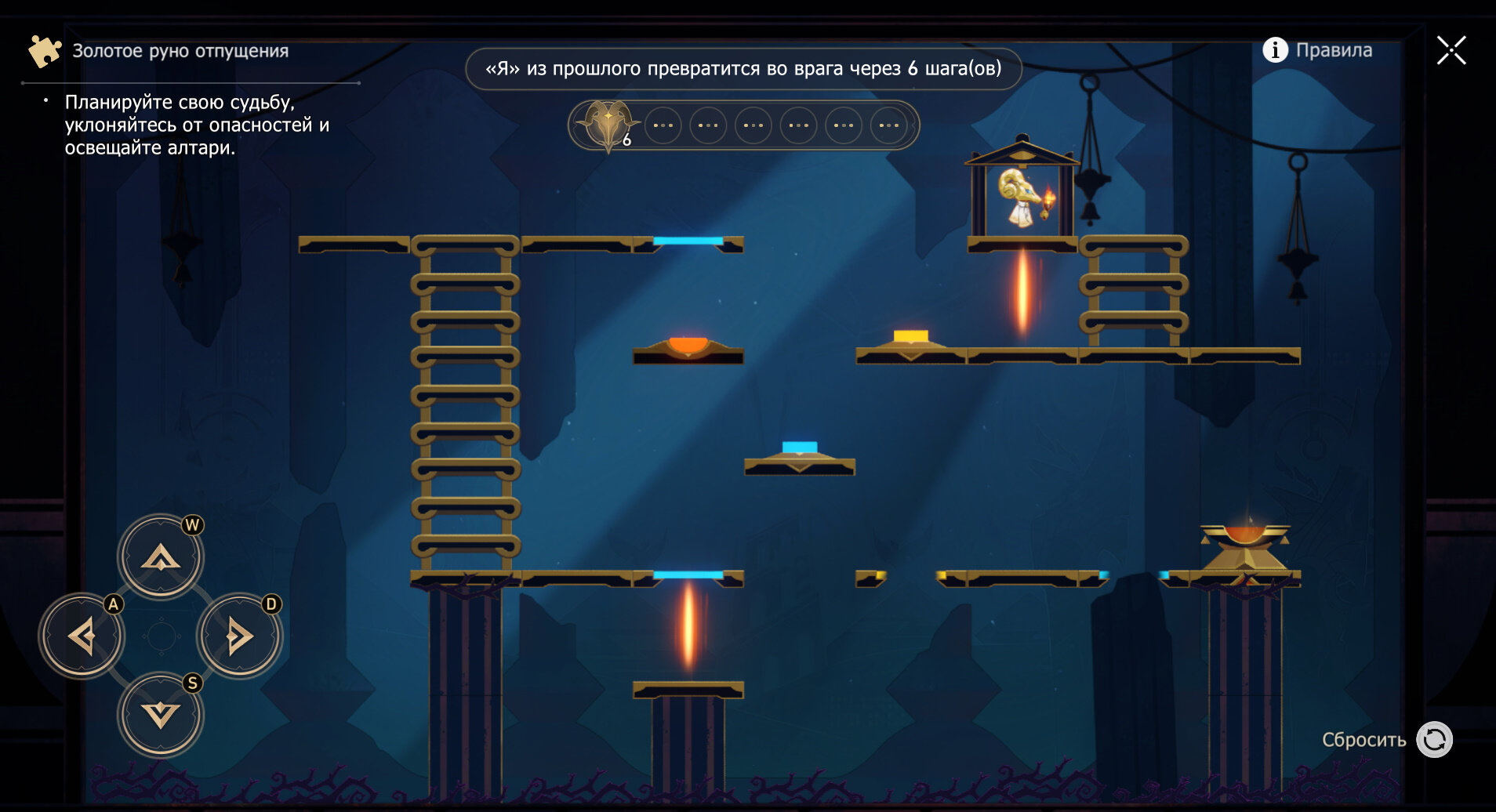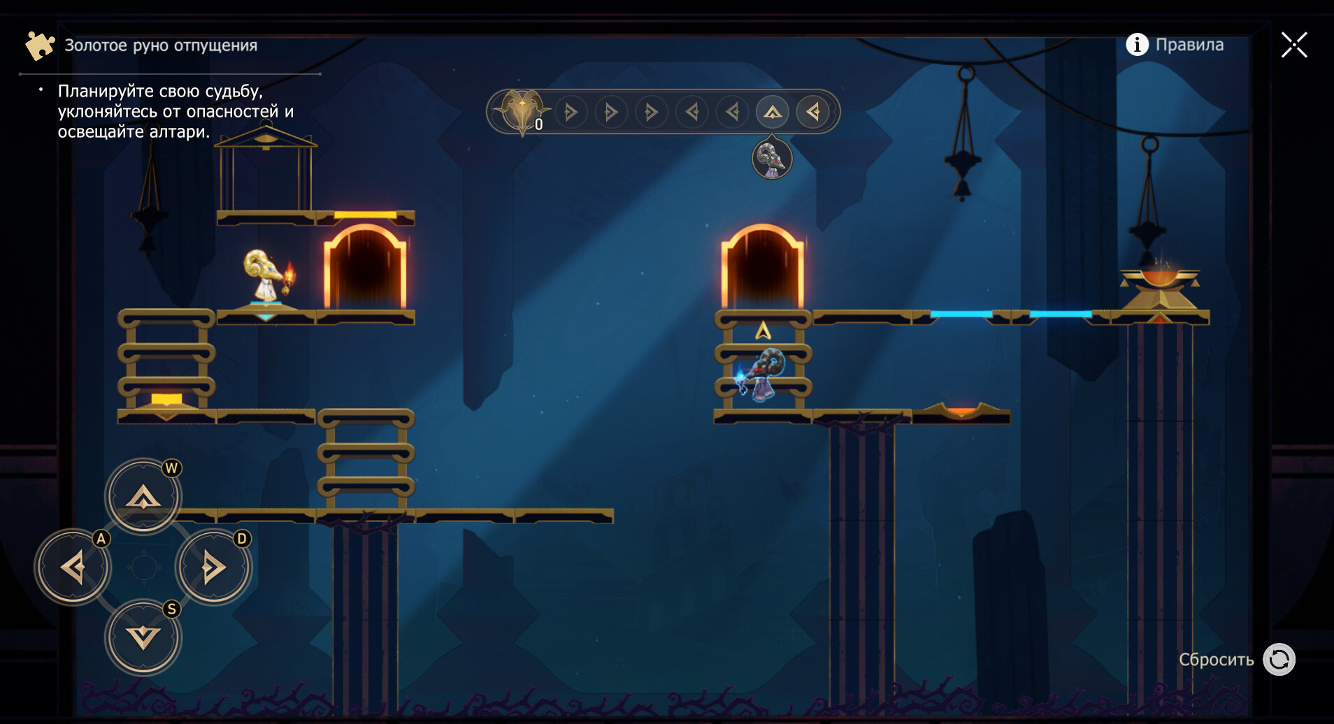 4. Самое трудное руно — четвертое. Дважды влево, один раз вниз — не прыгайте с лестницы на кнопку, а идите вправо. Затем трижды вправо, один раз вниз и дважды вправо.