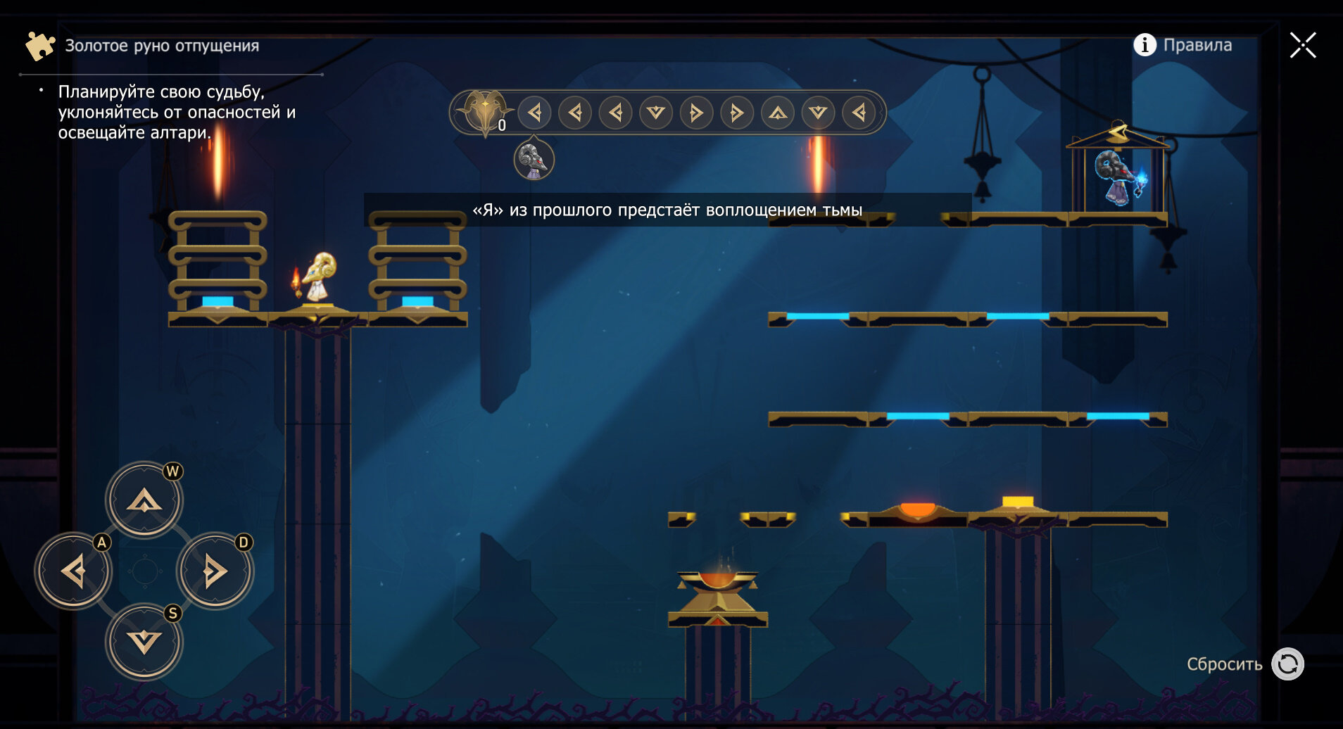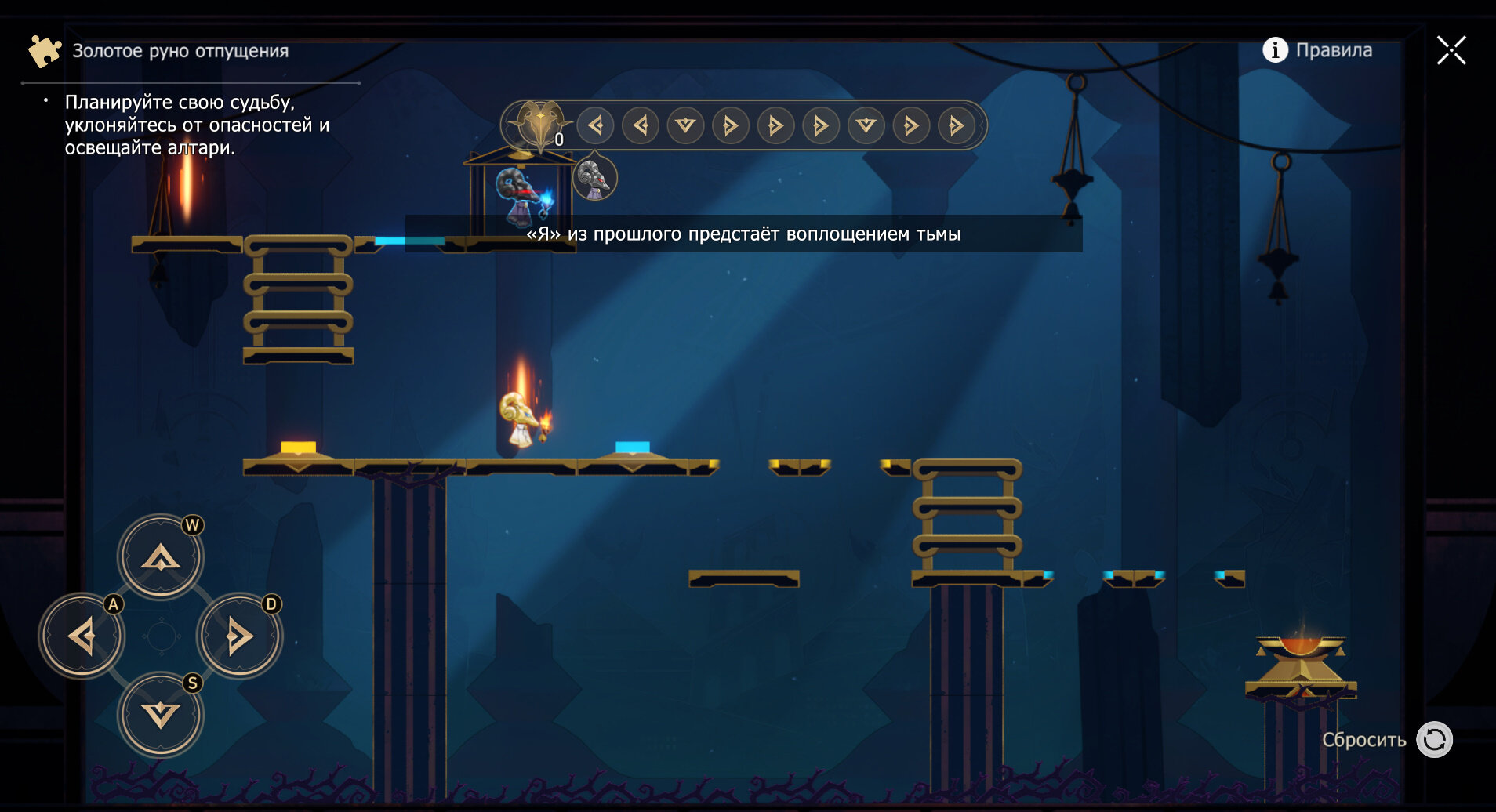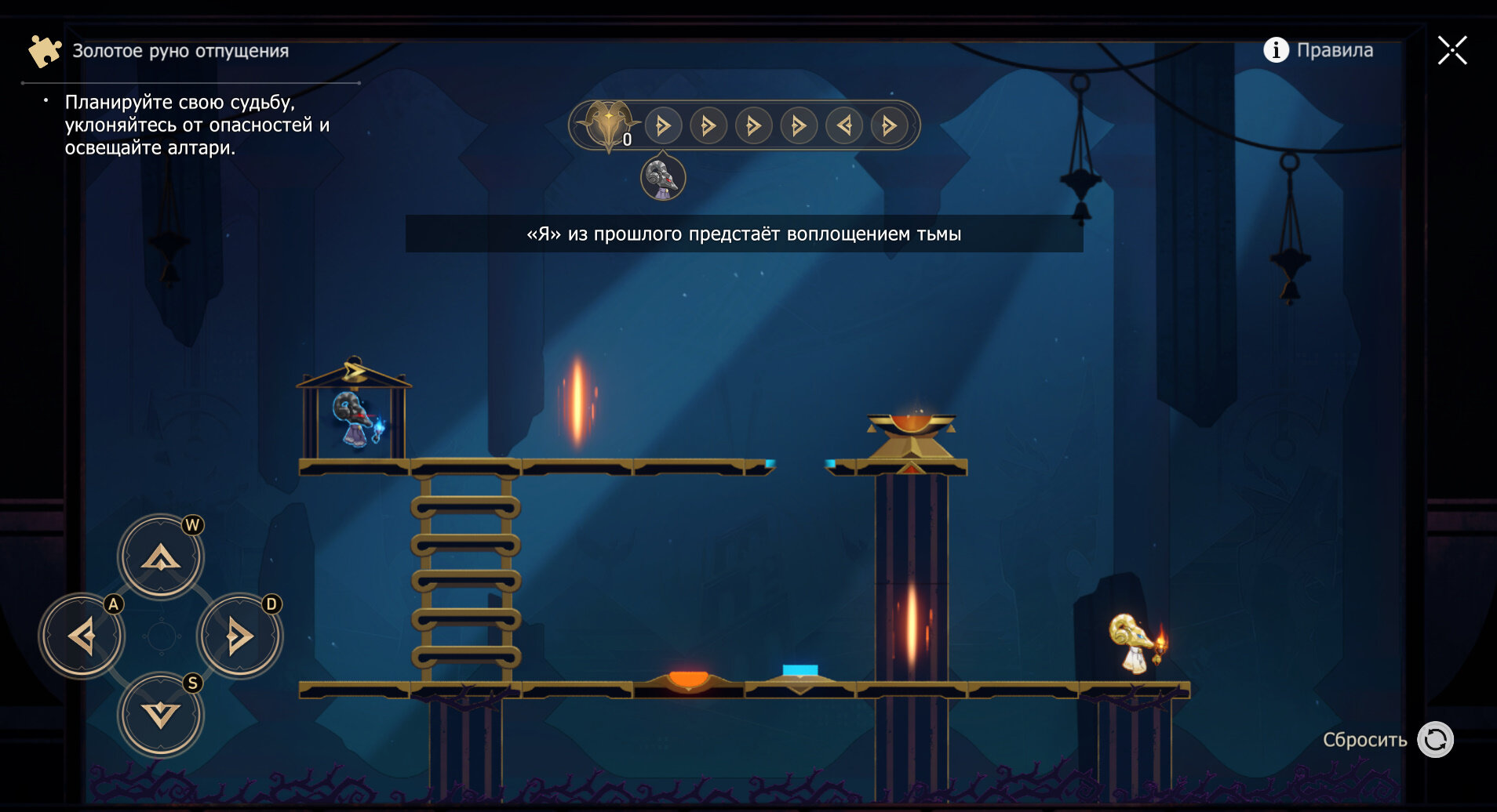 4. Самое трудное руно — четвертое. Дважды влево, один раз вниз — не прыгайте с лестницы на кнопку, а идите вправо. Затем трижды вправо, один раз вниз и дважды вправо.