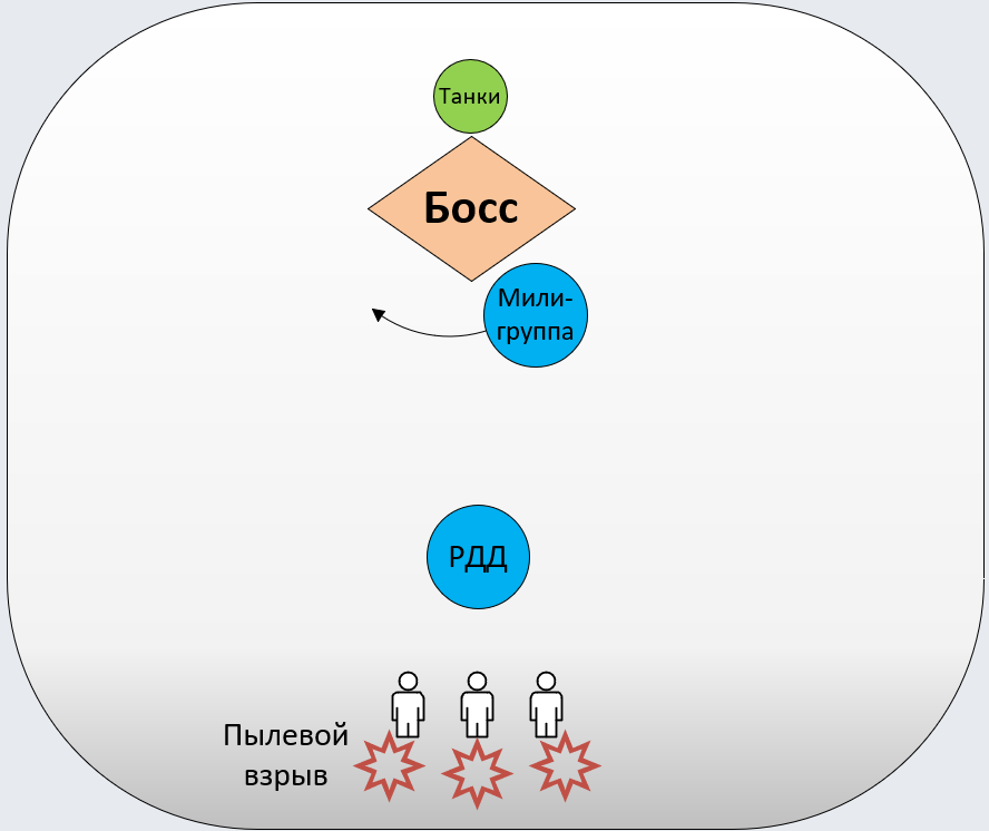 - трём добровольцам, которые будут принимать на себя «Пылевой взрыв», нужно будет встать на расстоянии 40 метров от босса, а друг от друга на 10 метров;