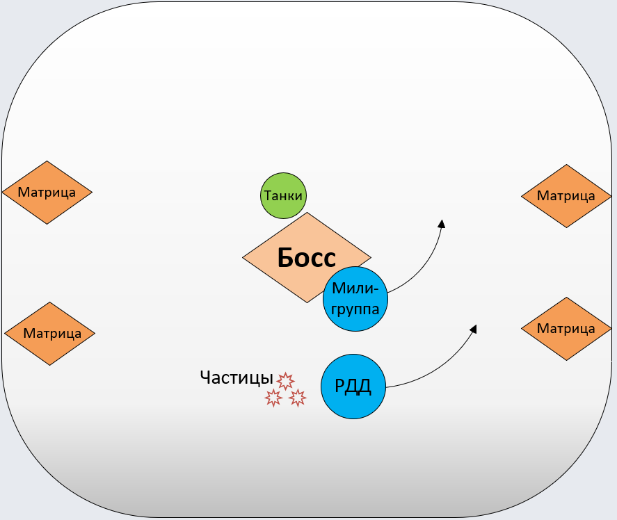 - бойцам дальнего боя и лекарям стоит держаться плотнее, им нужно двигаться в одну из сторон вокруг босса, когда он разбрасывает «Частицы» для их равномерного распределения;
