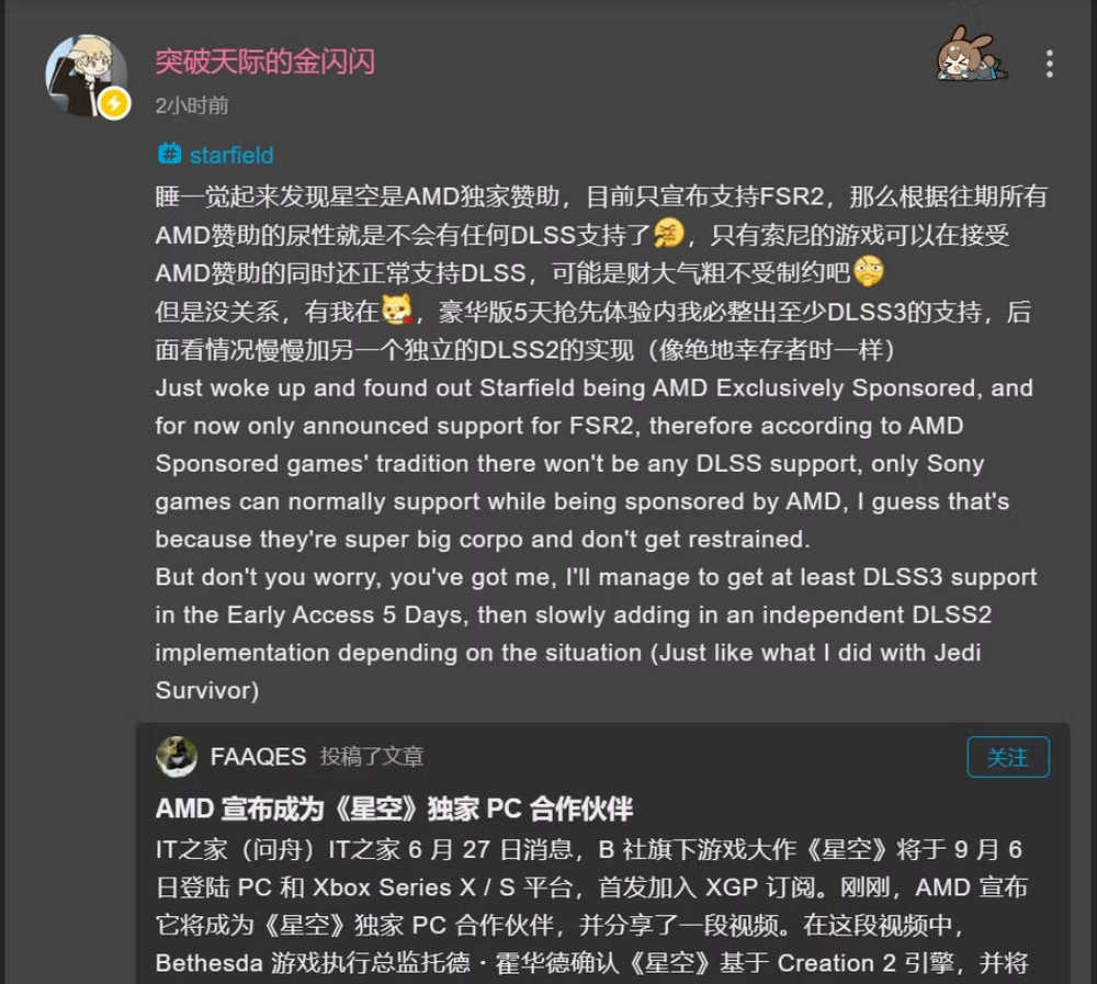 PureDark, популярный моддер, специализирующийся на реализациях апскейлеров и в частности на DLSS, заявил, что обеспечит поддержку флагманского апскейлера Nvidia в Starfield до окончания пятидневного периода раннего доступа. У PureDark уже есть значительный опыт добавления функций DLSS в игры, которые изначально не поддерживают этот апскейлер, как это было в случае с Star Wars Jedi: Survivor, еще одним флагманским партнером AMD.
