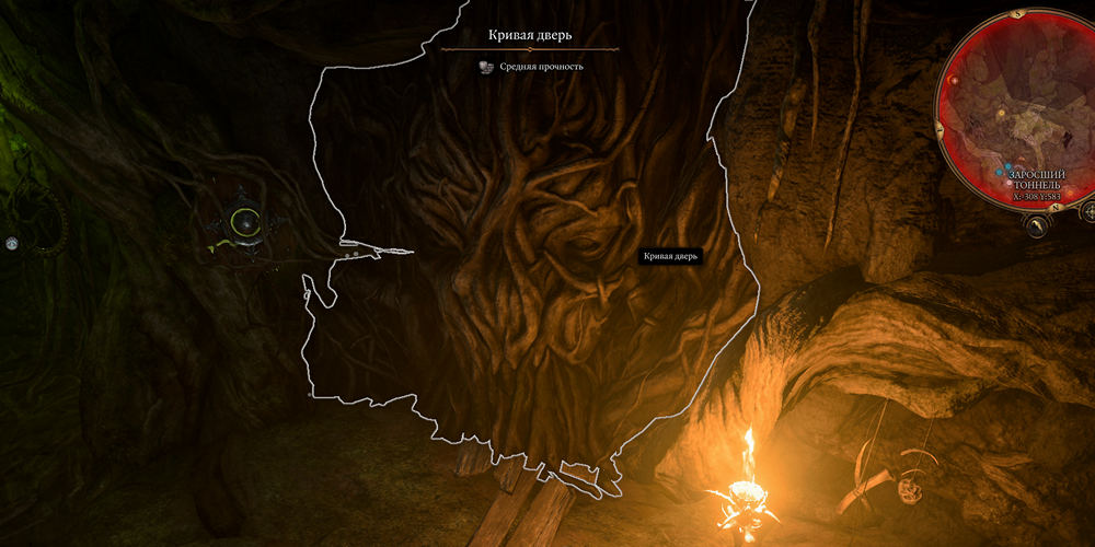 Кривая дверь находится в западной части тоннеля и является главным препятствием между вами и Каргой, похитившей Майрину и скрывшейся в недрах Чайного домика.