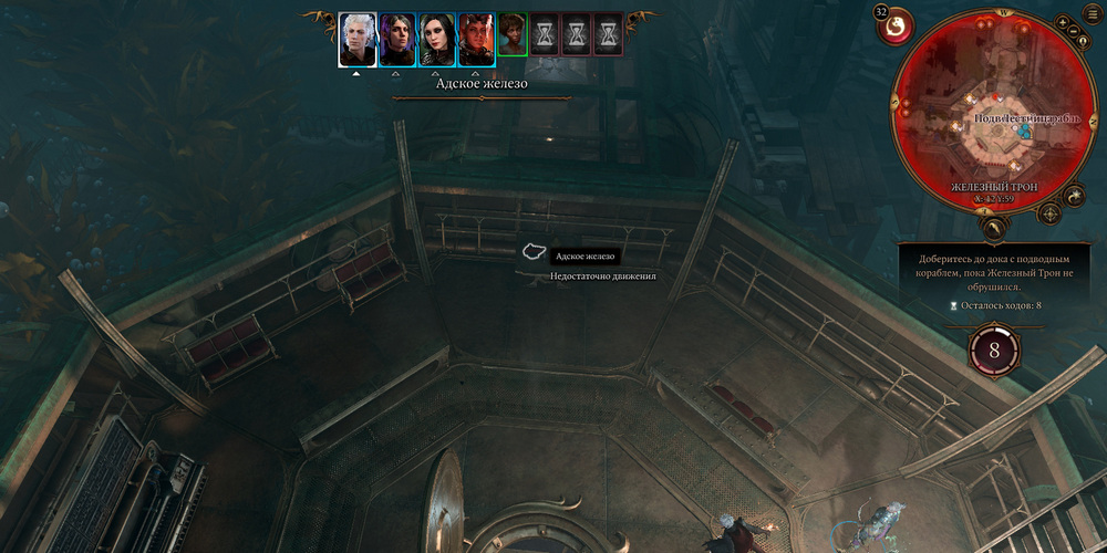 Такие квесты, как Спасти гондийцев и Спасти Великого Герцога, непременно приведут вас к подводной тюрьме — Железный трон. Время вашего пребывания там будет ограничено: лишь 6 или 8 ходами (последнее — на легком уровне сложности). Тем не менее, даже в таких условиях, у вас будет возможность собрать ещё один кусок Адского железа. Как только подводный корабль причалит к тюрьме, не спешите сразу направляться в глубины здания. Спуститесь по лестнице на один уровень ниже и внимательно осмотрите тамбур: на столе, вас уже ждёт искомый предмет — Адское железо.