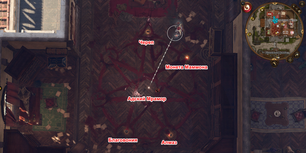 Перейдите в комнату, расположенную на втором этаже, и внимательно осмотрите демонический ритуальный круг. Согласно указаниям в гримуаре, алтарь, который является стартовой точкой, на деле оказывается столом Хелсик, расположенным в центре комнаты. Что касается расстановки предметов, необходимо открыть ваш инвентарь разместить их на соответствующих местах: