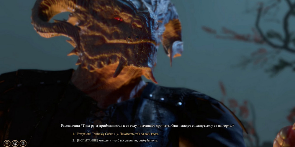 Прежде чем выбрать второй способ, настоятельно советуем выполнить сохранение игры. Непосредственно после получения новой формы, остальные спутники шокированные увиденным, потребуют объяснений. Чтобы сохранить их доверие и остаться в команде, игроку предстоит пройти проверку на Обман с D30. В случае неудачи, команда нападет на персонажа, и вы будете вынуждены убить их всех. Рекомендуется сохранять игру и продолжать попытки, до тех пор пока не удастся успешно их обмануть.