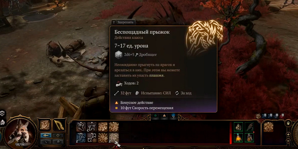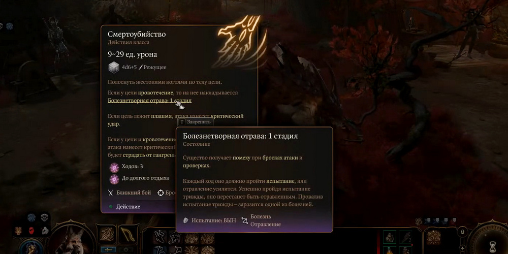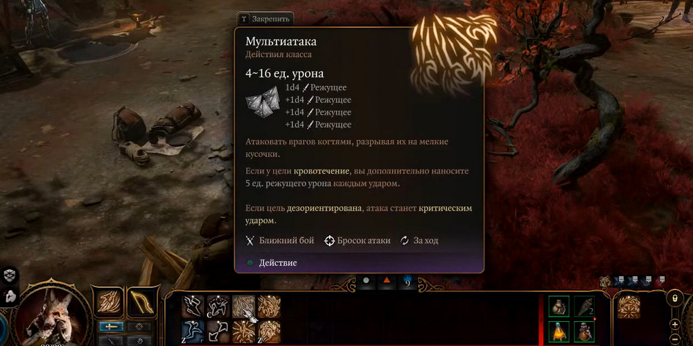 Наносит 2d10 режущего урона и вызывает Кровотечение на 3 хода. Кроме того, купаясь в крови противника, ваш персонаж восстанавливает свое здоровье от 2-12 Очков Здоровья за ход.