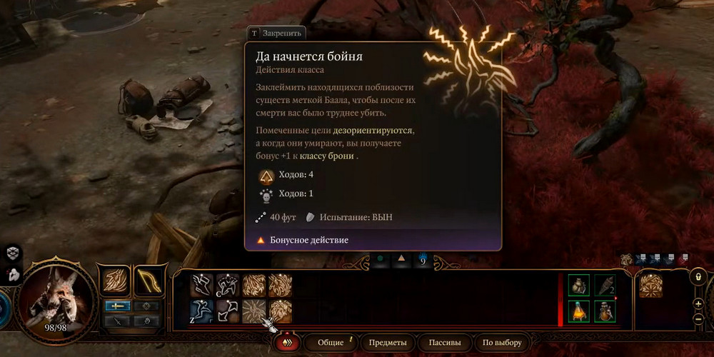 Эта атака не наносит урона, но накладывает на врагов дезориентацию на 1 ход и метку Баала на 4 хода. Эффект метки длится 4 хода. Если противник умирает в течение этого времени, вы получаете +1 к Классу Брони.