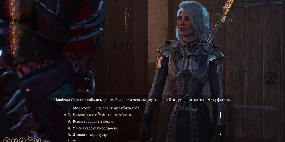 Убийств жрицы может вызвать недовольство и осуждение со стороны вашей группы, однако альтернативный путь оказывается еще более мрачным. В случае отказа от убийства Изобель, Скелеритас Гнус непременно посетит лагерь во время Долгого отдыха, ставя перед вами новое ужасающее требование: лишить жизни, возлюбленного или спутника с самым высоким уровнем одобрения. Согласие приведет к тому, что убийство будет осуществлено во сне, а в качестве награды персонаж получит Форму Убийцы.