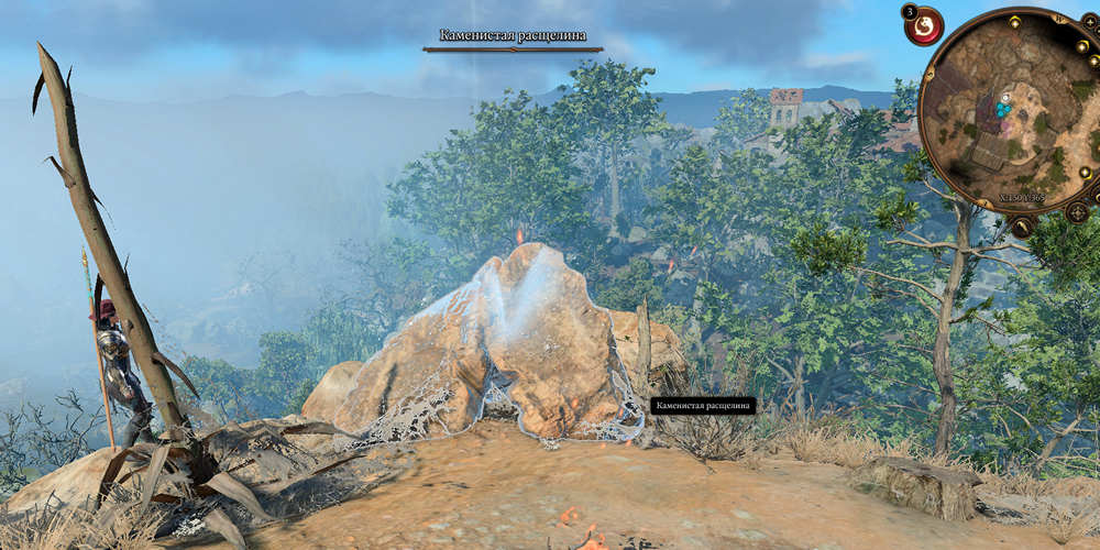 Пройдя этот участок, обратите внимание на скалистую трещину, расположенную с вашей правой стороны. Для взаимодействия с ней необходимо успешно пройти Проверку восприятия.