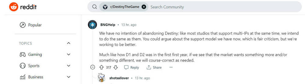 У нас нет намерений оставить Destiny; как и большинство студий, поддерживающих несколько франшиз одновременно, мы намерены поступить так же, как они. Можно высказать критику нашей текущей модели поддержки, и это справедливо, но мы работаем над улучшением. Аналогично тому, как это было с D1 и D2 в первый год, если мы увидим, что рынок хочет чего-то большего и/или чего-то другого, мы скорректируем наш курс по мере необходимости.