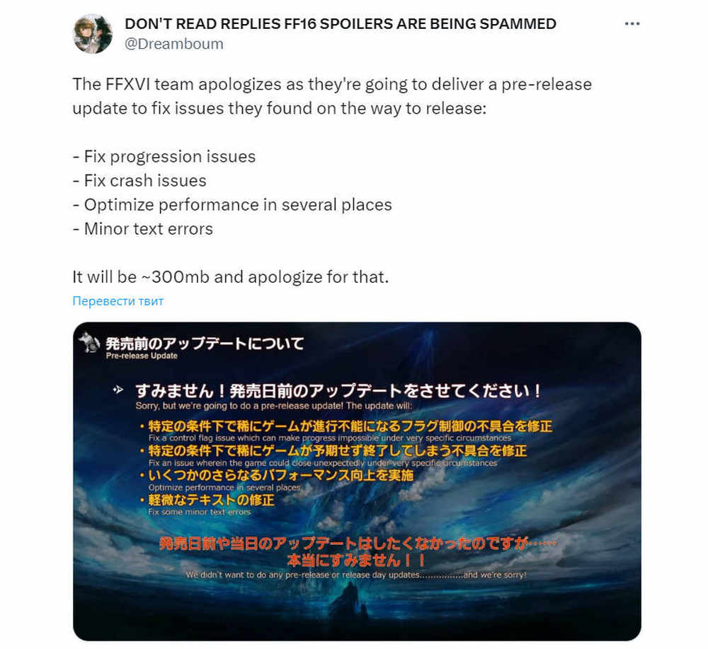 Несмотря на предыдущие заверения Square Enix об отсутствии необходимости в «патче первого дня» для Final Fantasy XVI, ситуация обернулась иначе. Компания вынуждена извиниться за отход от первоначальных планов, представив публике неожиданные новости о подготовке релизного патча.