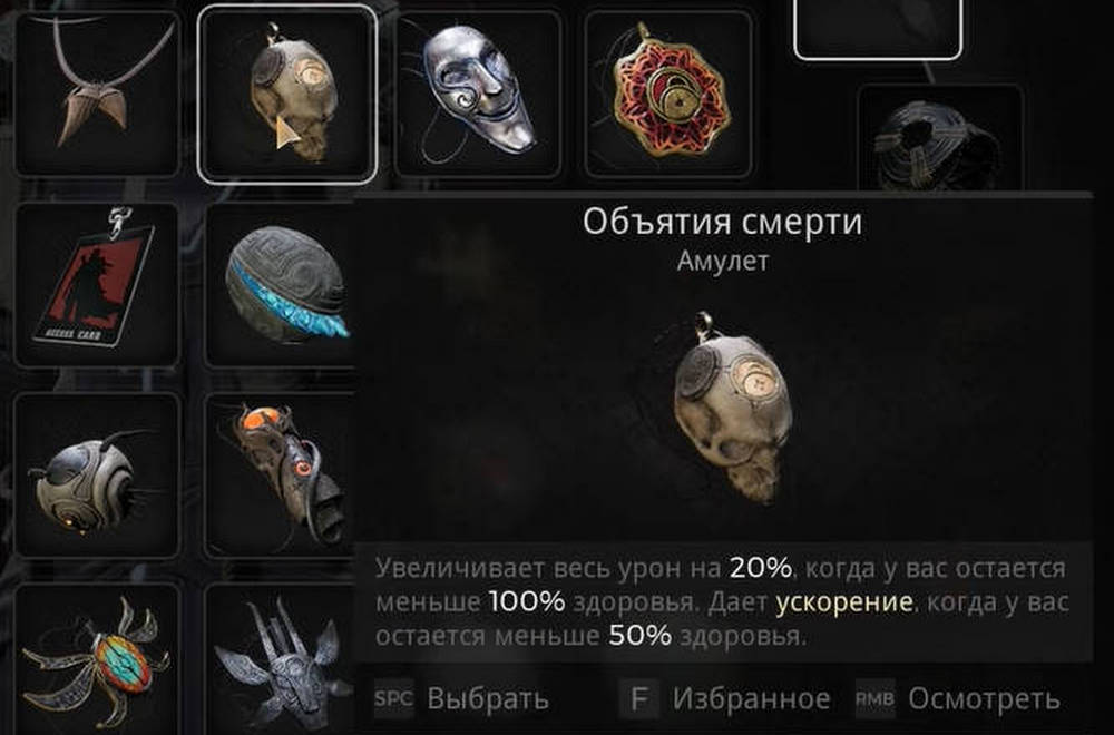 Амулет Объятия смерти представляют собой усовершенствованную версию Идола мести. Несмотря на то что он прибавляет меньший урон в сравнении с Идолом мести, его особенность активируется при получении игроком любого урона. Хотя такой амулет подойдет и дальнобойным Архетипам, он особенно будет полезен в руках агрессивных классов, например, Бойца (Challenger), к которым относится высокая защитная способность и огромный потенциал урона, что позволяет быстро устранять противников.