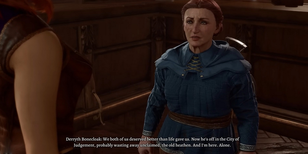 Если не отдавать Баэлену Доброгриб, то прибыв во Врата Балдура, герои могут вновь встретиться с Деррит в Аптеке Костяных Плащей в Нижнем Городе. В противном случае, Деррит уходит от мужа и больше не появляется в игре. В случае если Баэлен не использовал Доброгриб, пара будет продолжать свою торговлю в магазине, ограничивая взаимодействие игроков лишь возможностью покупок. Однако, если Баэлен погиб в ходе экспедиции в Подземье, игроки обнаружат в лавке одинокую, горюющую по утраченному супругу Деррит. Она делится мыслями о том, что тоскует по своему мужу и что они оба заслужили лучшей судьбы. Она также уверена, что Баэлен, будучи неверующим, навсегда останется в Городе Правосудия. В этом сценарии игрок может "оживить" магазин и утешить Деррит, приведя к ней одного из котов, живущих поблизости.