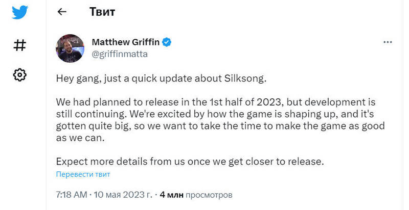 Мэтью Гриффин, PR менеджер Team Cherry, опубликовал в своем Twitter, информацию о возможной дате выхода Hollow Knight: Silksong. По его словам, игра должна была увидеть свет в первой половине 2023 года, но команда приняла решение отложить ее релиз. Гриффин заверил поклонников в том, что работа продолжается, развеяв слухи о возможном закрытии проекта. Он также упомянул, что игра стала "довольно крупной", а команда находится в предвкушении того, как игроки будут поражены, когда Silksong наконец выйдет.