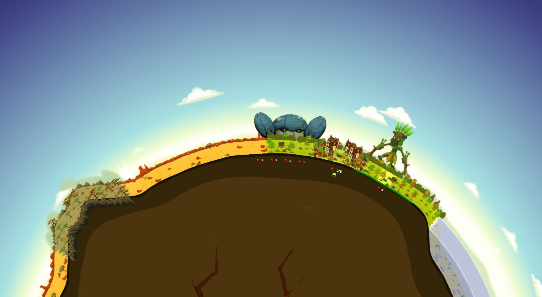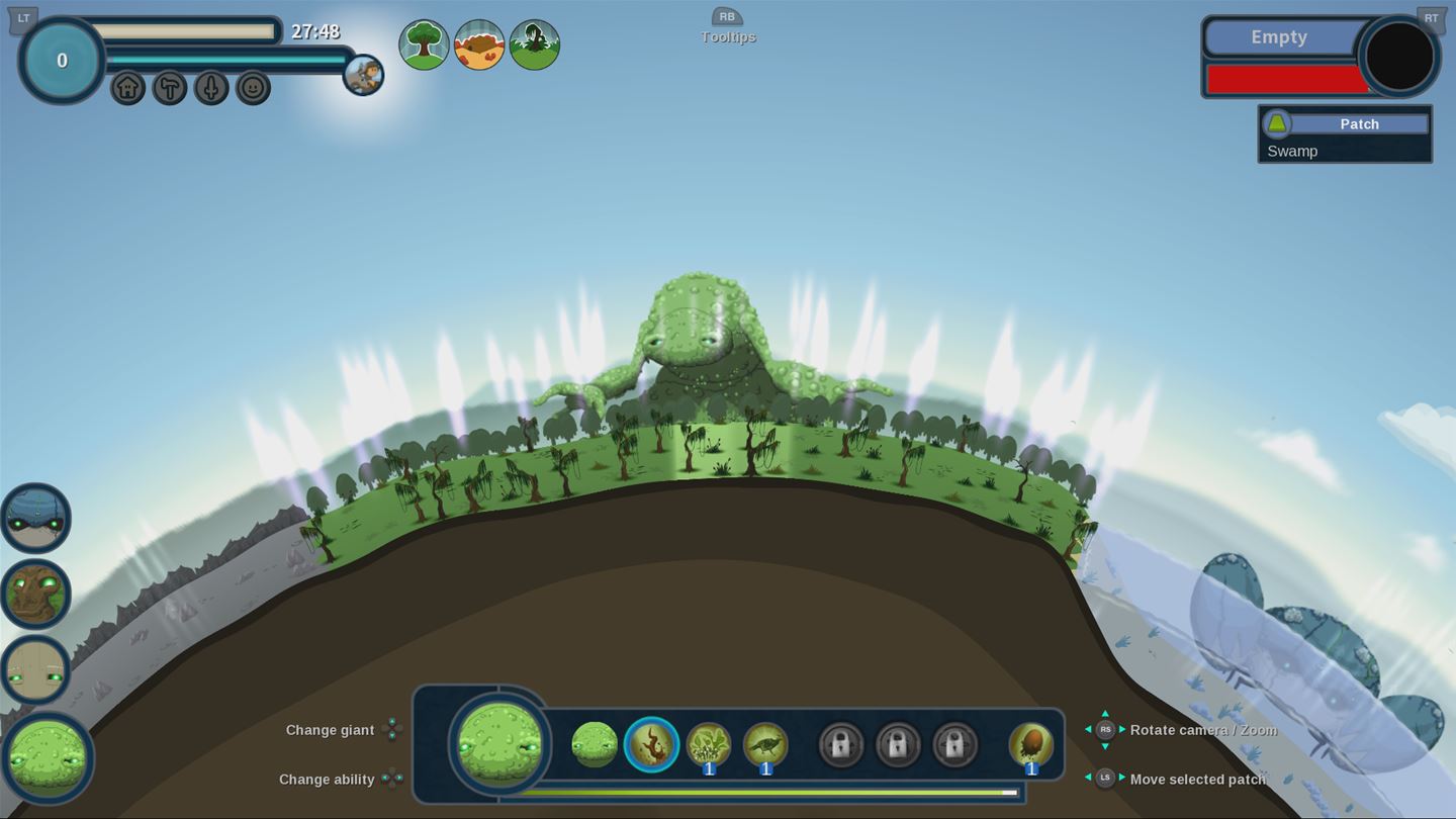 Добро пожаловать в Reus — игру, где вы не просто бог, а самый настоящий ландшафтный дизайнер вселенной с божественной лицензией! Забудьте о скучных молитвах и жертвоприношениях: здесь ваша святая обязанность — создавать идеальные условия для жизни человечества, которое, конечно же, в ответ будет вас обожать (или устраивать ядерные войны, но это уже их проблемы). Эта инди-стратегия в жанре «симулятор бога» предлагает вам взять под контроль четверых могущественных титанов — Гигантов, каждый из которых отвечает за свою стихию: воду, землю, растения и животных. Ваша задача — превратить безжизненный камень в цветущий рай, полный ресурсов, биомов и довольных поселенцев.