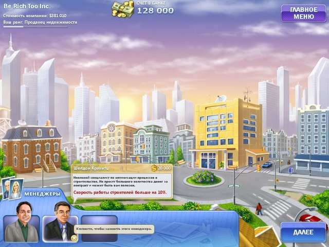 Геймплей Be Richer! — это идеальный микс стратегического планирования и динамичного менеджмента. Вам предстоит набирать команду первоклассных специалистов, от ассистентов до инженеров, чтобы справляться с заказами городских властей. Строительство жилых кварталов, возведение стадионов и коттеджей — лишь верхушка айсберга. Каждый уровень — это новая головоломка, где нужно грамотно распределить ресурсы, соблюсти сроки и при этом не обанкротиться. Игра предлагает несколько уровней сложности, так что и новички, и опытные стратеги найдут себе занятие по душе. А благодаря трёхмерной графике наблюдать за тем, как ваш маленький проект превращается в шикарный мегаполис, — одно удовольствие!