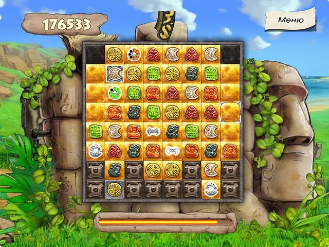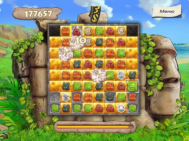 Геймплей Хранители сокровищ. Остров Пасхи — это идеальный микс классической механики «три в ряд» и захватывающего сюжетного квеста. Ваша задача на каждом уровне — превращать серые, безжизненные клетки игрового поля в золотые, собирая комбинации из разноцветных драгоценных камней. Чем сложнее комбинация, тем мощнее специальные бонусы: бомбы, молнии и другие хитрые штучки, которые помогут вам справиться даже с самыми заковыристыми головоломками. Игра разделена на пять частей, в каждой из которых вас ждет по девять уровней, наполненных логическими задачками и секретами. Это не просто клик-клак по самоцветам, это настоящая археологическая экспедиция для вашего мозга!