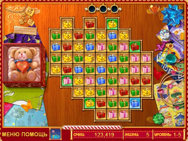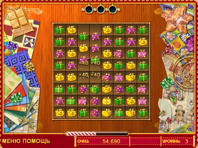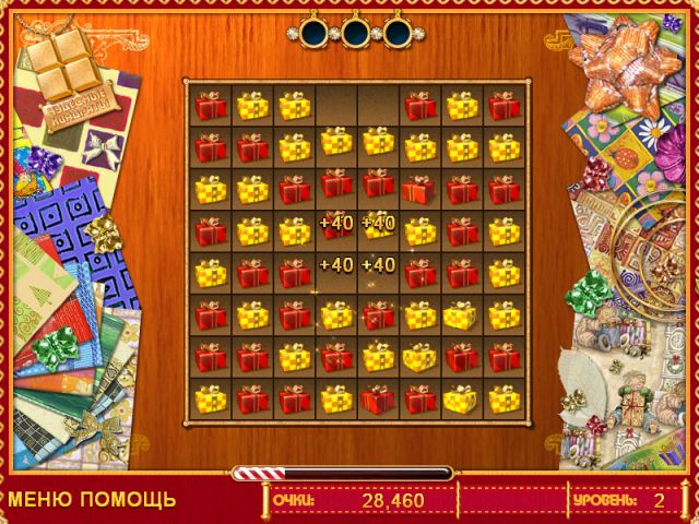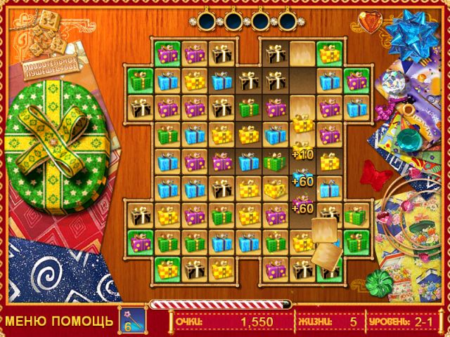 В мире Лучший Подарок вас ждут шесть красочных игровых миров и целых сто уровней, каждый из которых — это новая загадка для вашего ума. И не думайте, что это будет легко! Иногда фишки упрямятся и будут стоять, как вкопанные. Но у вас есть секретное оружие против любой головоломки: волшебные бонусы! Знакомьтесь: "Волшебная палочка" — ваш личный феерический инструмент для освобождения застрявших плиток. А вот "Радужный" бонус — это настоящий мастер на все руки, который превратится в фишку любого нужного вам цвета, чтобы вы могли собрать ту самую победную комбинацию. С такими помощниками вы не просто играете, вы творите магию на игровом поле!